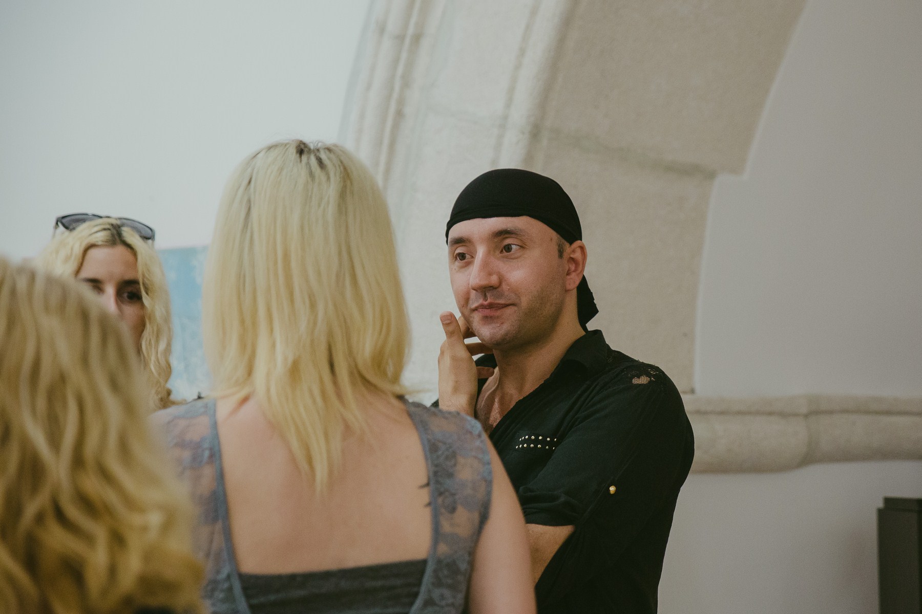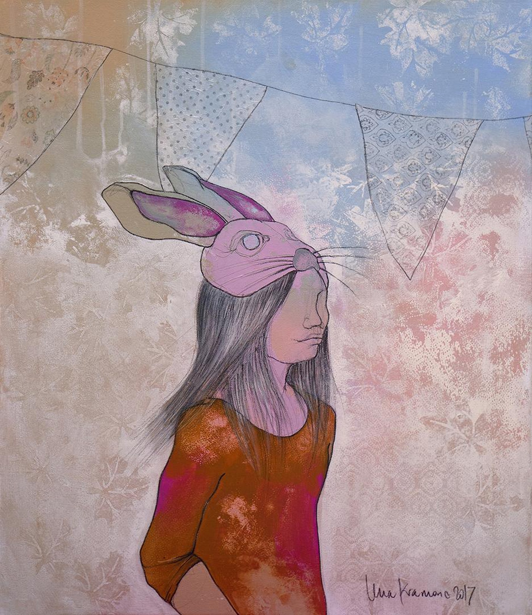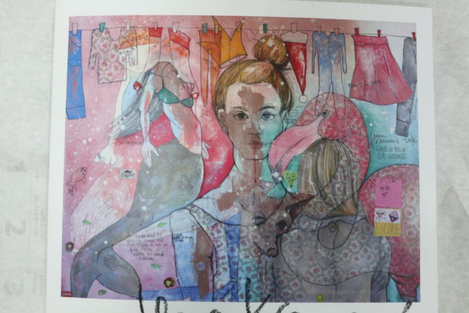 Eksperiment je prva riječ koja mi pada na pamet kad razmišljam o Leninoj izložbi pod nazivom „Ateljerija“. Osim što izlaže već gotove radove kroz koje je realizirala priču o vlastitim stanjima i raspoloženjima, a naposljetku i životu, ona smjer kretanja kista nastavlja na još uvijek nedovršenim radovima kroz koje želi dovršiti svoju priču, dok sasvim prazna platna ostaju „priča za sebe“ – na njima će se upisati novi likovi, nove boje i nove, začudne kompozicije, jedan cijeli novi svijet koji čeka da bude ispričan. Tematski gledano, umjetnica u svom stvaralaštvu ostaje vjerna sebi svojstvenim prizorima žena, djevojaka i djevojčica u pomalo neobičnim pozama kao i svojoj pastelnoj gami uz prisutnost dekorativnih elemenata, kao što su otisci sa salveta koji djeluju poput printa ili pak magičnost zlatne boje, šljokica i perlica sa cvjetnim uzorcima koje lijepi na svoje radove dajući im određenu sceničnost i ljepotu izričaja u vizualnom i psihološkom smislu. Sloboda kojom nanosi slojeve boje na još nedovršene radove odlučnim potezima kista daje i nama slobodu asocijacija u gledanju i tumačenju oslikanih prizora. Njezini prizori obuhvaćaju isključivo ženske senzualne i gotovo krhke figure djevojčica i žena koje su ponegdje ritmično poredane jedna do druge omogućavajući nam da ih raspoznamo, dok su drugdje nabacane u hrpe koje osim što nam daju slobodu viđenja, također emaniraju nered i nemir prožet osjećajem majčinstva i dječje igre.
