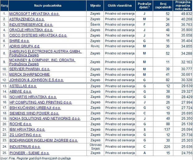 Većina tih tvrtki, njih 23, u stranom su vlasništvu, najveće plaće su u Microsoft Hrvatska, gdje je prosječna neto plaća gotovo 50 tisuća kuna.