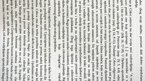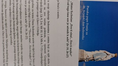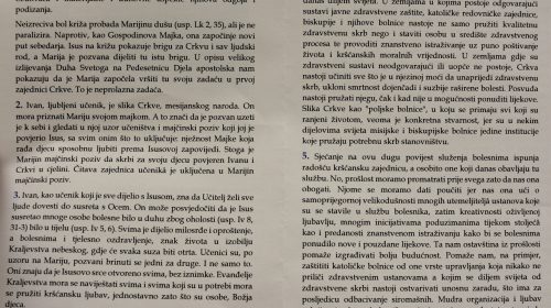 Nakon misnog slavlja vlč. Odilon pročitao je ovogodišnju poruku Pape Franje za Svjetski dan bolesnika i dao svoj kratki osvrt na Papinu poruku i njen sadržaj. Prisutne je pozdravio i domaćin, rektor HKS-a prof. dr. Željko Tanjić koji je izrazio zahvalnost organizatorima i prisutnima na ovogodišnjem susretu uz želju da HKS i dalje bude domaćin obilježavanja i molitve za Svjetski dan bolesnika.
