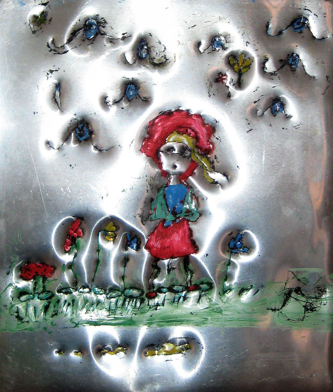 Idejno-misaoni koncept geometrijskog reda raskida se dodavanjem aluminijskih folija, kojima se privlači pozornost promatrača svojom dominantno sjajnom, blještavom pojavnošću. Vertikalno-horizontalna harmonija drvenih okvira razbijena je odbljescima metalnih elemenata kojima se naglašava dinamika prikaza. Dodatno akcentiranje pobuđeno je nepravilnom udubljeno-ispupčenom obradom aluminijskih folija, prenošenjem crteža svojih kćeri udubljivanjem u aluminijsku foliju ili, jednostavno, crtanjem i slikanjem po njoj tušem i flomasterima u boji.