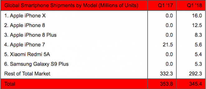 Odmah ispod njega je iPhone 8, koji je prodan u 12,5 milijuna primjeraka, a slijedi ga iPhone 8 Plus s brojkom od 8,3 milijuna. Četvrti na listi je još jedan Appleov proizvod, i to iPhone 7 s 5,6 milijuna prodanih, a peti Xiaomi Redmi 5A, s brojkom od 5,4 milijuna.