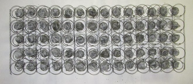 Drugo lice ove izložbe su svitci od žica i bijelih, nenapisanih A4 papira. Ne mogu a ne sjetiti se Aleksandrijske biblioteke iz vremena 4. stoljeća kada je prije navale kršćana (i nešto kasnije knjiških moljaca) „brojala najmanje pola milijuna sistematično organiziranih, označenih i na police razmještenih svitaka…“. Nije li to povijesni trag sjećanja na svitke znanja, sveden na formu utiska (ili otiska) koji ga utjelovljuje kao jeku i ornament. Ta se sublimna figura prasjećanja na znanje, sintetizira u trag pripuštenosti drugom da se označi. Ja ga označavam tako. Kao već slijepu erudiciju svoje prastare pramajke i kao gluhonijemi vapaj žudnje da se opet nastavim gdje sam onda stala u poganim, slobodnomislećim oblicima sveznanja koje je lebdjelo nad vodama. Logično, Eugen asocira izvedbom na ono što smo zvali siromaškom (arte povera) minimalnošću dostupnog materijala. Njegovo svjedočenje odsutnošću obilja nije odsustvo svjedočenja.