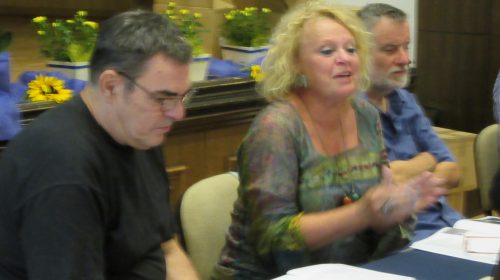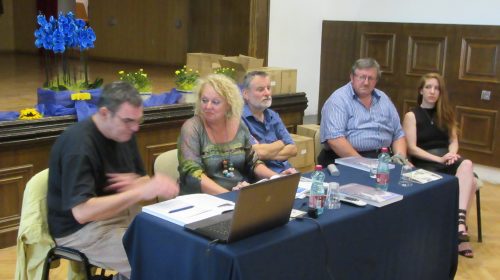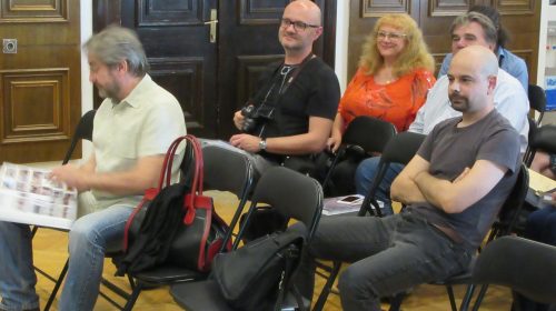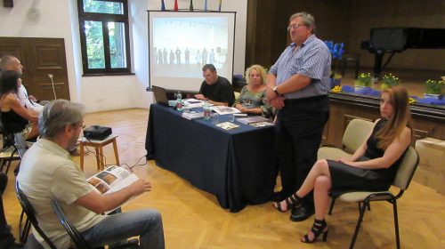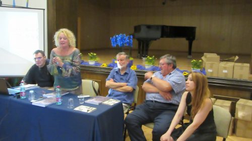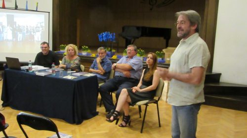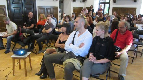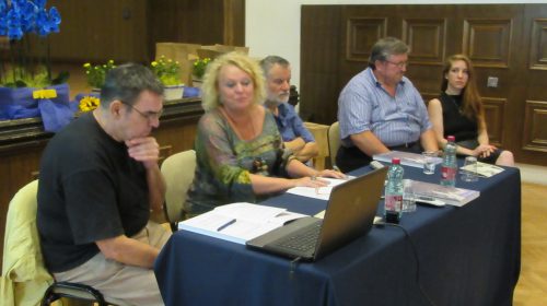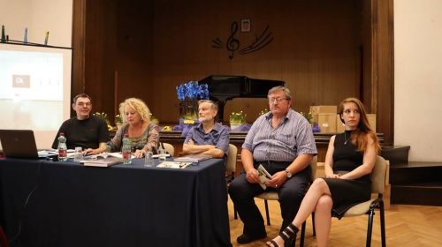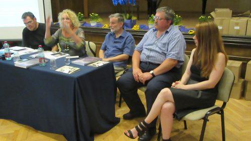Prezentatorica: Narcisa Bolšec Ferri. Uz nju su autor monografije Eugen Borkovsky (lijevo), jedan od aktivnih inicijatora i aktera događanja, sin jednog od prvih umjetnika – doseljenika na Grožnjan – Rok Zelenko (desno), načelnik općine Grožnjan Claudio Stocovaz te lektorica i jedna od urednica monografije Doris Pandžić.