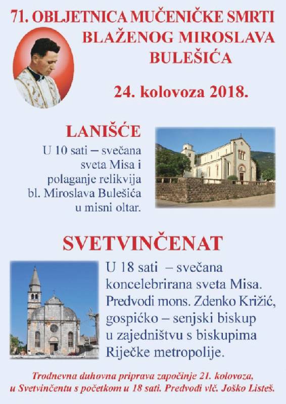 Istoga dana u župnoj crkvi Sv. Kancija, Kancijana i Kancijanile u Lanišću s početkom u 10 sati bit će slavljena svečana misa tijekom koje će relikvije bl. Miroslava Bulešića biti položene u misni oltar. IKA