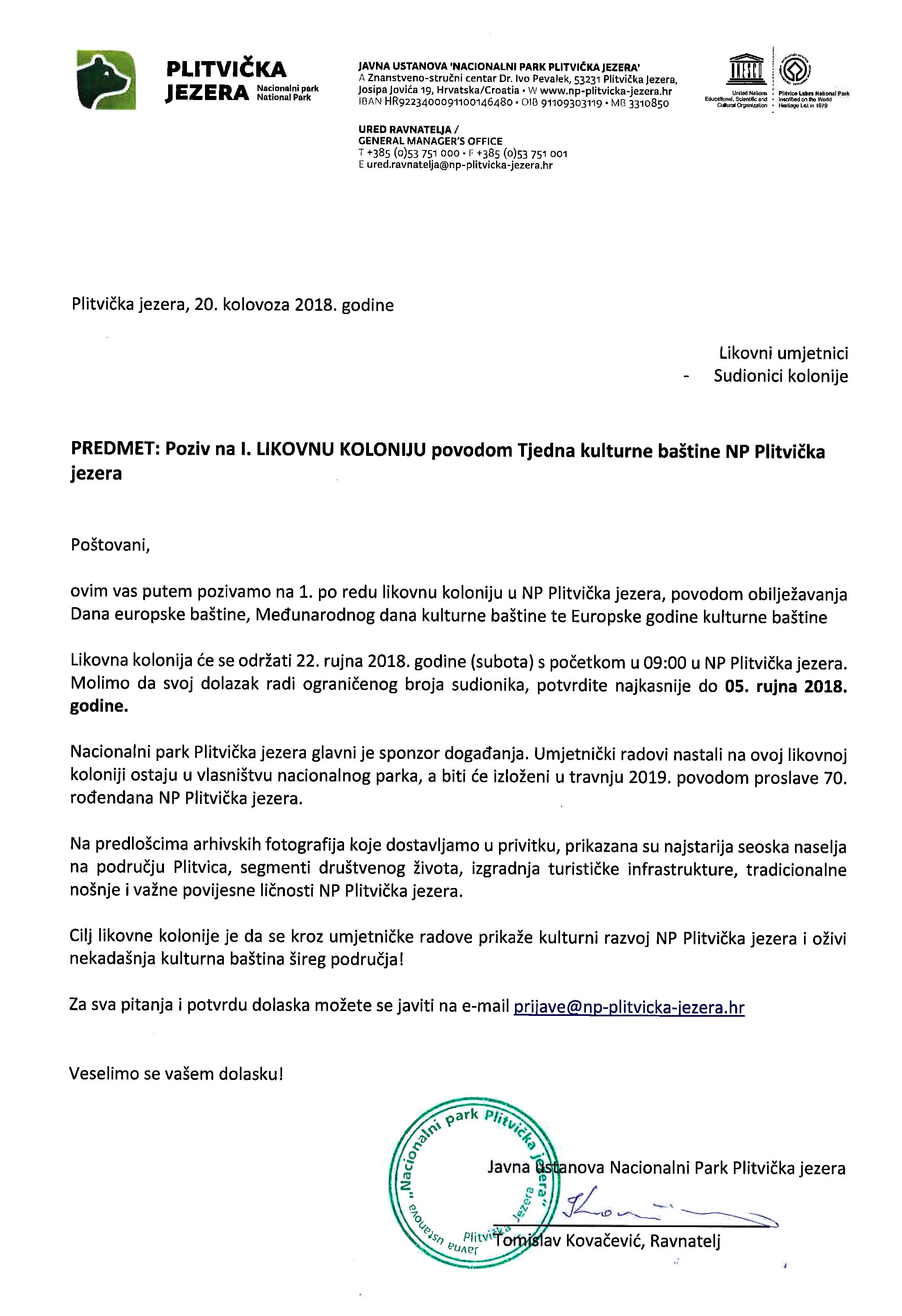 NP Plitvička jezera organizira likovnu koloniju koja će se održati 22. rujna 2018. godine povodom Tjedna kulture na Plitvicama. Tema likovne kolonije je kulturna baština NP Plitvička jezera, a želja organizatora je oživiti nekadašnje stare fotografije po viđenju svakog slikara ponaosob koje možete pogledati u galeriji
