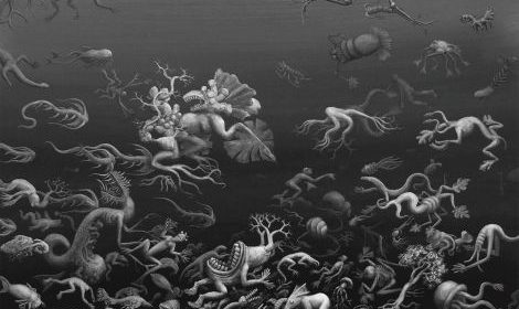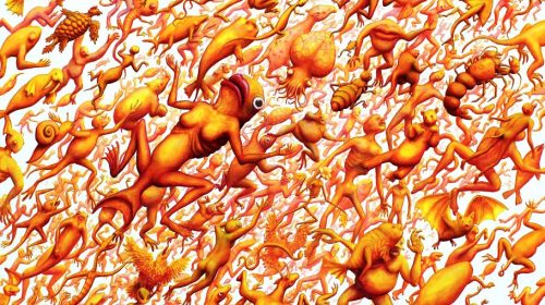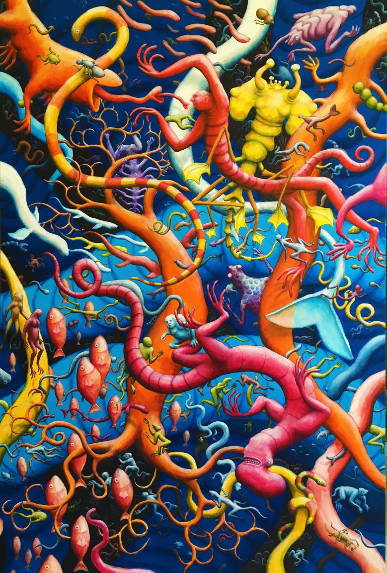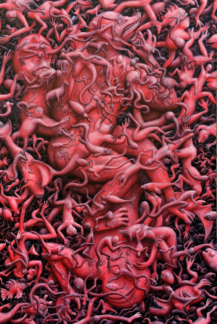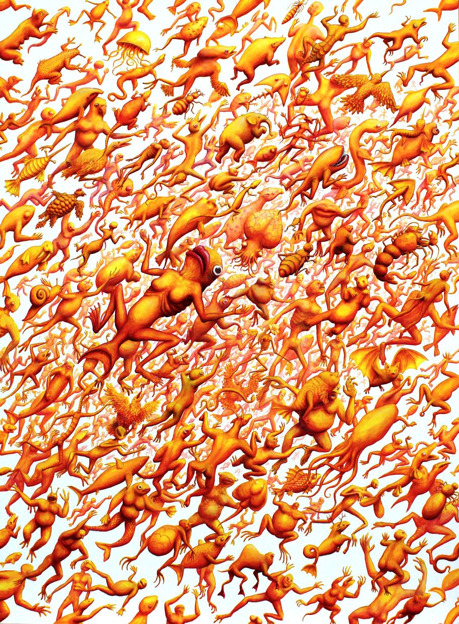 Na slici EX NIHILO vidimo prvoga čovjeka u nastajanju, nakupinu stijena koja misli. Prve riječi proizašle iz ljudskih usta bile su imena životinja koje je naš predak izgovarao plivajući u disperziji živih bića. Ogromni svemir u kojemu postojimo nastao je iz ničega i organizirao se u jednostavnu materiju koja je s vremenom postajala tako kompleksna da je to neshvatljivo. Nekada davno na Zemlji nije bilo ničega osim gologa kamenja, a danas vidimo eksploziju života. Naše tijelo je sačinjeno od materijala s površine ovoga planeta. Svi smo mi planet Zemlja. Ova slika je zamišljena kao rad u kojemu se gledatelj utapa, zbog čega ju je potrebno doživjeti u originalu, ili reprodukciji pune veličine. Centralni lik čovjeka je glavni lik samo ako sliku gledamo iz daljine. Kako joj se približavamo glavni lik postaje onaj na kojega se koncentriramo, a kružno gibanje jata riba tjera našu pažnju na slijedeći fragment ne dozvoljavajući nam da se zadržavamo na određenome detalju predugo. Iako slika ilustrira nekoliko različitih mitologija odjednom, ona je po svojoj prirodi apstraktna. Bazira se na vrsti nepotpune simetrije gdje je jedna strana konkretnija od druge raspršenije strane, što nas navodi na lažni zaključak da nešto negdje nedostaje, nešto što bezuspješno tražimo pogledom. Pozadina slike je bezlična siva boja koja predstavlja ništavilo iz kojega paradoksalno cvijeta život. Iako se na prvi pogled doima da se radnja na slici odvija u vodi zbog mnoštva riba koje su tu radi kruženja naše pažnje, kada bolje pogledamo, vidimo suživot kopnenih, morskih i letećih životinja. Čovjek je odvojen od njih veličinom, centralnim položajem i izgledom koji nas čak i ne podsjeća na živo biće, a kamoli čovjeka. On je tek njegov začetak, amorfna nakupina zemlje koja se dijeli na dva bića poput jednostanične životinje.