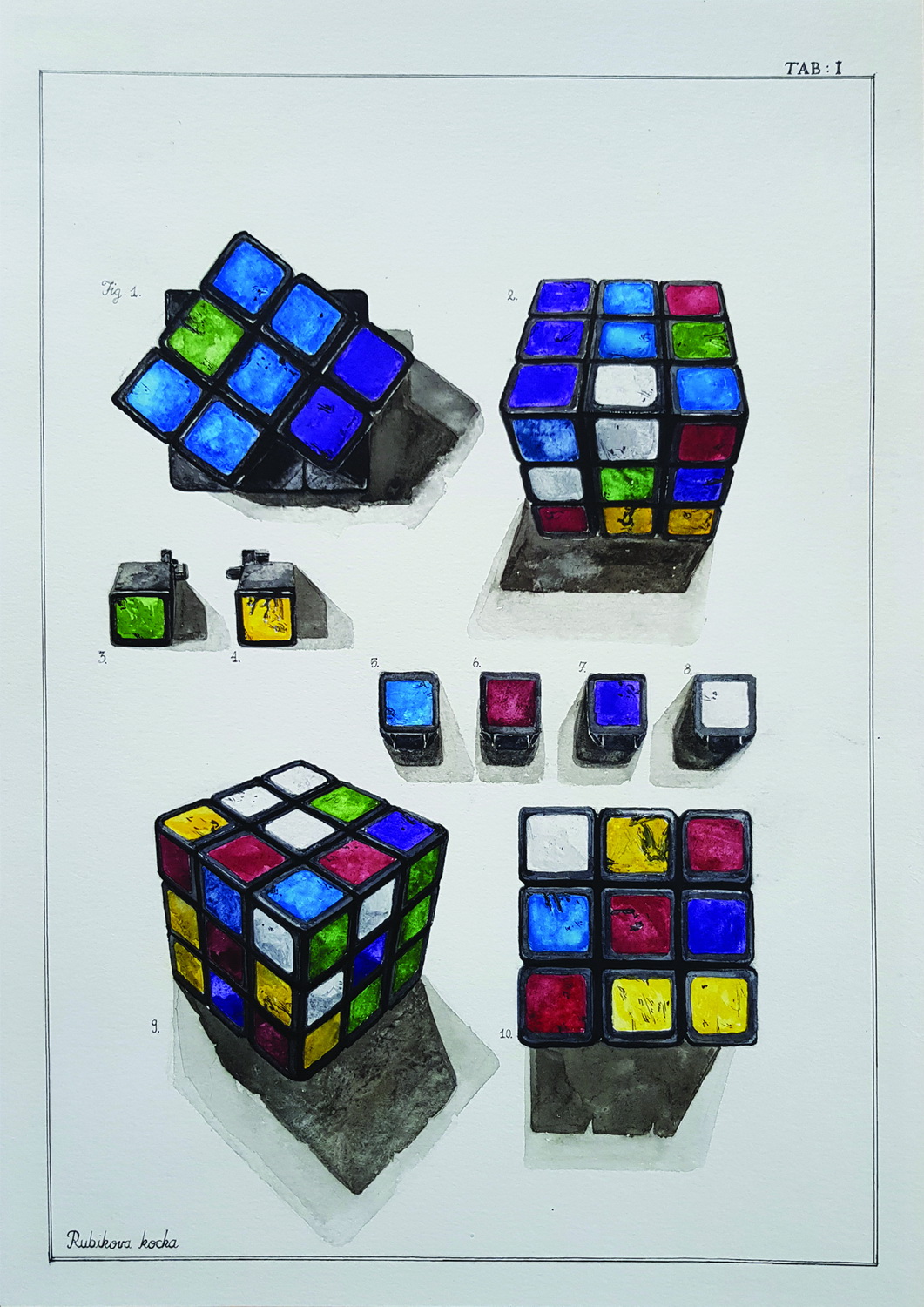 Akvareli Mirana Šabića predstavljeni na izložbi tek su dio jedinstvene kolekcije koja je nastala nakon što je autor na tavanu obiteljske kuće pronašao kutiju prepunu uspomena iz djetinjstva. Otkriveni predmeti poslužili su kao podloga za razradu i nastanak ciklusa koji je umjetnik podijelio u tri međusobno povezane zbirke. Prvu zbirku čine predmeti koje je umjetnik preparirao i smjestio u teglice ispunjene mješavinom formalina i alkohola uz dodatak destilirane vode, drugu zbirku čini grafička mapa od pet listova u grafičkoj tehnici dubokog tiska (bakropis i suha igla), dok je treća zbirka sastavljena od dvanaest tabli rukom naslikanih slika u tehnici akvarela. Određeni predmet u pojedinoj zbirci okidač je memorije na jedno iskustvo, sjećanje ili uspomenu. U ciklusu akvarela svaki pojedini predmet detaljno je i precizno naslikan i numeriran, te tematski organiziran po tablama. Tako primjerice na tabli Japanska igra pojedinac može promotriti zasebno prezentirane sastavne dijelove predmeta, te izgled predmeta u cjelini. Ovakav hladan, distanciran, precizan i krajnje znanstveni pristup prikazu predmeta u potpunoj je suprotnosti s njihovim značenjem obzirom da je riječ o predmetima koji su autoru dobro poznati, bliski i u djetinjstvu često korišteni, te su bili glavni akteri u stvaranju uspomena i formiranju umjetnikove ličnosti prilikom odrastanja. Zasigurno najrazrađenija tabla je ona pod nazivom Lego kocke. Tematski poslagane i podijeljene u niz podgrupa, Lego kocke su ilustrirane i razložene do najsitnijih detalja i najmanjih samostalno prepoznatljivih rekvizita. Promatrajući izložene table daje se naslutiti kako sâm proces sistematiziranja, organiziranja i podjele, te potom minucioznog i strpljivog bilježenja pojedinih elemenata u tehnici akvarela uključuje meditativni misaoni proces prilikom kojeg umjetnik prezentacijom privatne zbirke svog djetinjstva omogućuje povezivanje na razini kolektivne memorije s čitavom jednom generacijom koja prepoznaje artefakte, jer su isti bili sastavni dio i njihovog djetinjstva.