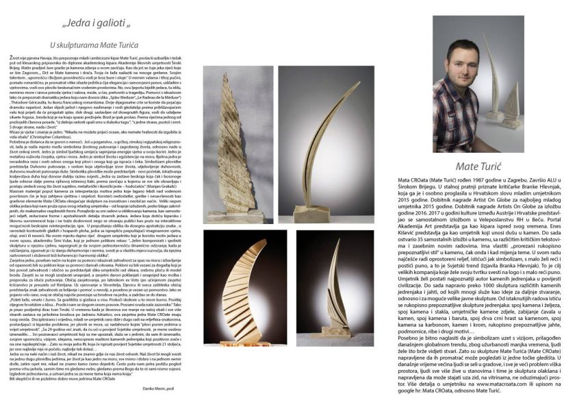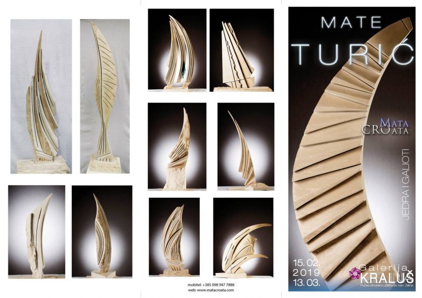 Mata CROata (Mate Turić), magistar kiparstva, mladi već afirmirani umjetnik – kipar ispred svog vremena, završio je Akademiju likovnih umjetnosti stekavši zvanje magistra kiparstva i profesora likovne kulture, izložio je dio svojih radova pod nazivom “Jedra i galioti” u zelinskoj Galeriji Kraluš koje možete pogledati do 13. ožujka 2019. godine.