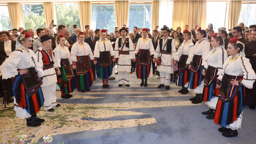 Dan otvorenih vrata za Hrvate Bosne i Hercegovine u Uredu predsjednice. Na video snimci predsjednica Republike Kolinda Grabar-Kitarović, fra Emanuel Josić, KUD “Koraćanski dukati”, učenice OŠ fra Stipana Vrljića iz Sovića. video HINA/ Lana SLIVAR DOMINIĆ
