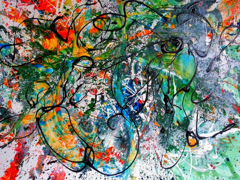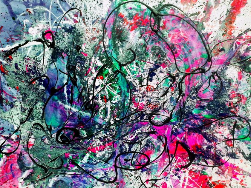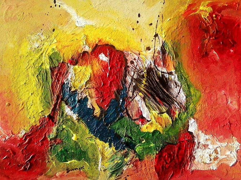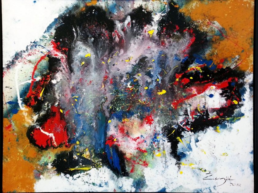 Žunjić kombinira slike s prskajućim strelicama boje koje jure u svim mogućim pravcima ili su to pak nešto mirnije obojane plohe, tamne i nežive, umrtvljene,slabe, s jedva vidljivim znacima života.