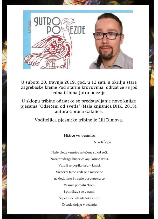 U sklopu tribine održat će se predstavljanje nove knjige pjesama Odsečeni od svetla (Mala knjižnica DHK, 2018), autora Gorana Gatalice.