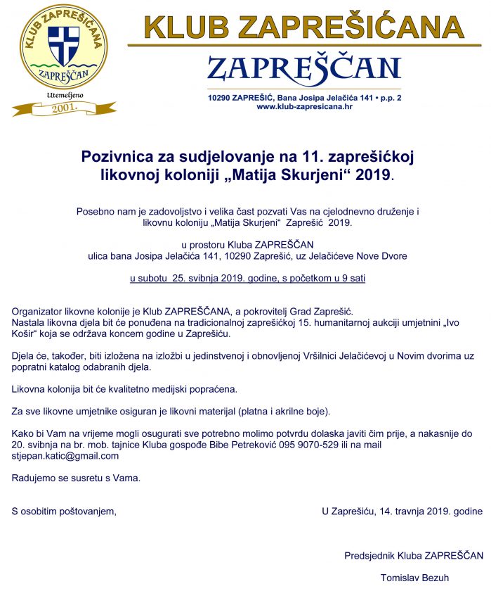 Ovogodišnja, 11. po redu, zaprešićka likovna kolonija “Matija Skurjeni” 2019. održati će se u prostoru Kluba ZAPREŠČAN, ulica bana Josipa Jelačića 141, u Zaprešiću, uz Jelačićeve Nove Dvore, u subotu 25. svibnja 2019. godine, s početkom u 9 sati