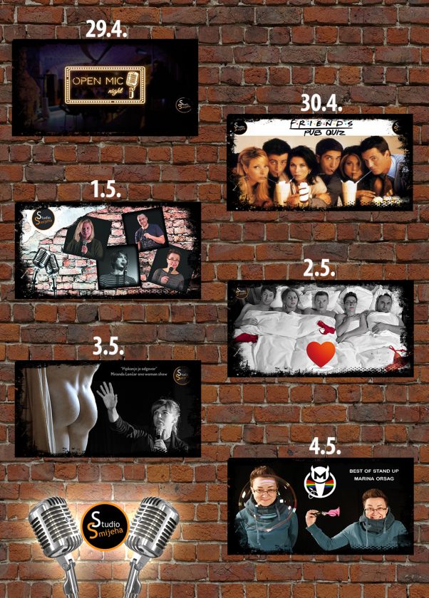 Praznik rada (srijeda, 1.5.) proslavit će se uz ‘Best of stand up 2018 vol 2’. Nastupaju rezidenti Vlatka Mifka, Marko Dejanović, Marina Orsag i Tihomir Paravina. Istoj ekipi u četvrtak (2.5.) pridružit će se Tin Sedlar u ‘Sextra Large tematski stand up powered by Masculan’, kultnom showu o seksu, pornografiji, fetišima, škakljivim temama, uz prigodnu kostimografiju i puno smijeha. U istom tonu nastavlja se u petak (3.5.) s ‘Pipkanje je odgovor (BiH)/ Miranda Lončar One Woman Show’.