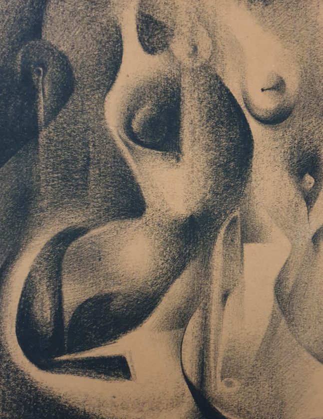 Muževni vid: oporost, bezbojnost, nazubljenost. Feminini vid: blagost, obojanost, mekoputost. U odnosu na linearnu askezu kojom Kinert rabi grafičku alatku flomastera, Nadin je pastel bujne izražajnosti, raspona od paučinaste niti do sipkog rastera. Kinert posve neutralnu podlogu bijelog papira koristi kao kontrastnu opreku gustim grafičkim prepletima, dočim Nada podlogu reljefnog i tamno toniranog rižinog papira koristi kao integralnu izražajnu sastavnicu. Konačno, reski crno-bijeli kontrast u Kinerta (prvotno crni trag flomastera vremenom se, utjecajem svjetla, pretvorio u zagasito ljubičasti) u kontrastnoj je opreci spram višebojnih Nadanih crteža, koji suptilnim gradacijama valera posjeduju birani koloristički bouquet.