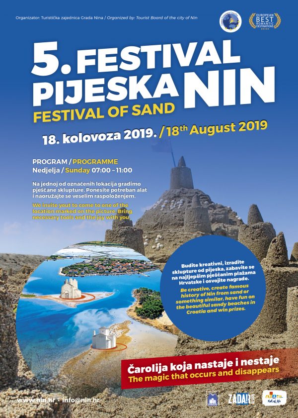 Turistička zajednica Grada Nina i ove godine organizira Festival pijeska gdje će se graditi kule i skulpture od kvalitetnog ninskog pijeska pod vodstvom umjetnika i kipara