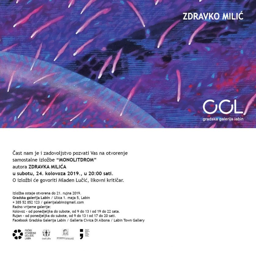 Izložba pretežno retrospektivnog karaktera Monolit, labinskog umjetnika Zdravka Milića u Gradskoj galeriji Labin, svojevrstan je inventarni postupak nedavne autorske prošlosti, izvjesno sagledavanje sažetka vlastitog rada ali i težnja k iznalaženju novih polazišta za buduća dostignuća i proširenja određenog temata. Milić je odbrao Monolit, temu koju je započeo početkom 2000-ih godina i koju s manjim odstupanjima permanentno proučava, proširuje i postavlja u različite kontekste. Razlog rezimiranju ovog, vjerojatno autoru najdražeg ciklusa, tim je smisleniji što će tijekom izložbe biti promovirana i monografija Zdravka Milića kao tiskani sažetak njegovog pedesetogodišnjeg umjetničkog stvaralaštva. Nevjerojatno zvuči podatak da će labinska publika sada prvi put vidjeti ove amblematične Milićeve radove, jer ih autor igrom slučaja, nikada nije izlagao u svome rodnom gradu.