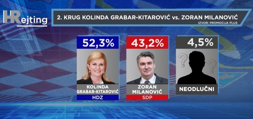Da je danas drugi krug predsjedničkih izbora, u srazu sa Zoranom Milanovićem aktualna predsjednica Kolinda Grabar-Kitarović osvojila bi drugi uzastopni mandat. Grabar-Kitarović dobila bi 52,3% glasova, Milanović 43,2%, a neodlučnih birača u ovom duelu nema mnogo – 4,5%.