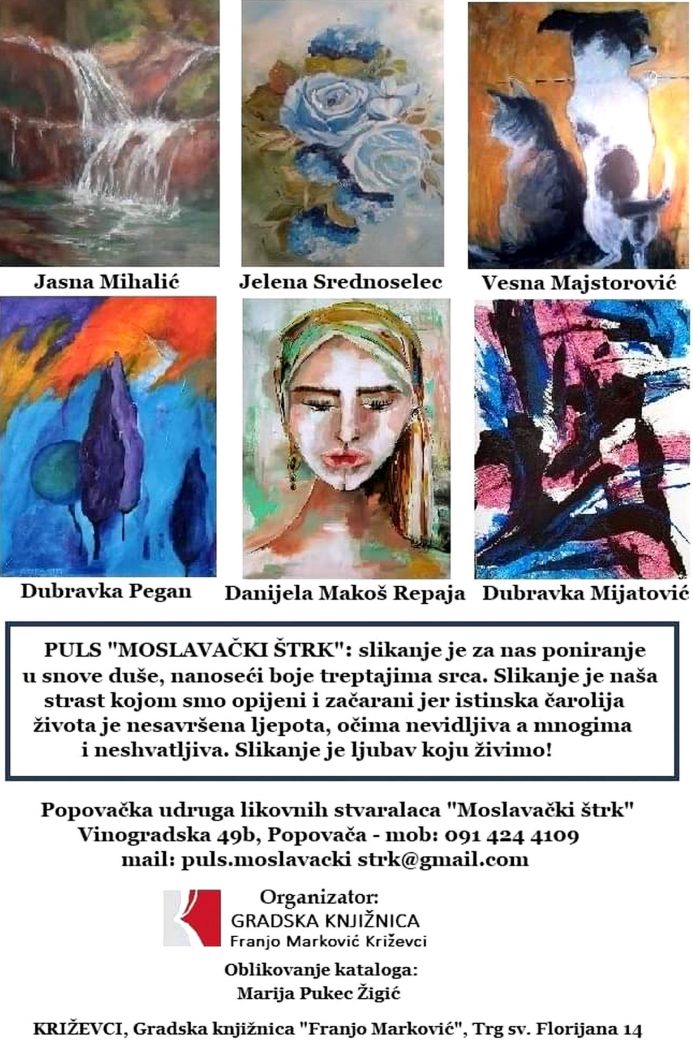 U Gradskoj knjižnici Franje Markovića u Križevcima, 26. studenog otvorena je izložba pod nazivom “Ljubav postoji” članova PULS-a “Moslavački štrk”. Prigodnim riječima dobrodošlice prisutne je pozdravila ravnateljica knjižnice Marjana Janeš Žulj te zahvalila PULS-u na priređenoj izložbi i naglasila kako s izložbom “Ljubav postoji” završava još jedna uspješna izlagačka godina u Gradskoj knjižnici Franje Markovića. Predsjednica PULS-a Marija Pukec Žigić zahvalila je organizatoru i križevačkoj publici na odazivu napomenuvši da je sretna zbog višegodišnje odlične suradnje članova “Moslavačkog štrka” sa Križevačkim likovnim krugom te interpretirala svoje dvije pjesme. Da odlična suradnja postoji potvrdila je i Zdenka Vrabec, predsjednica KLK-a, koja je nakon toga izložbu proglasila otvorenom. Izložba “Ljubav postoji” može se pogledati do 13. prosinca u radnom vremenu knjižnice.
