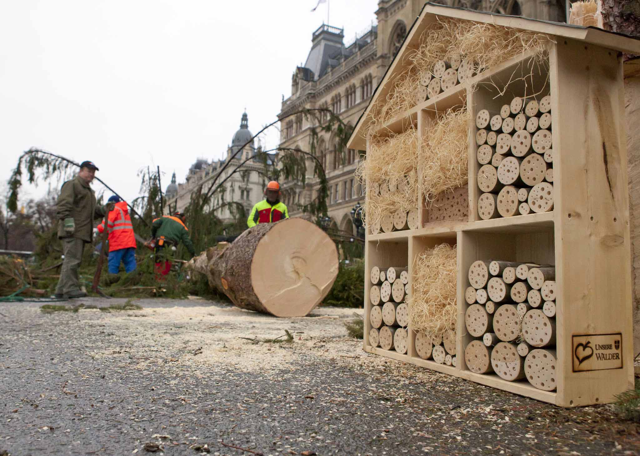 Veliko božićno drvce ispred Gradske vijećnice koje je ove godine stiglo kao dar pokrajine Donja Austrija je u ponedjeljak uklonjeno bečkog glavnog traga. No time ne završava njegova živiotna priča. Radnici bečkog komunalnog poduzeća će od njega naime izraditi 11 „hotela“ za korisne kukce