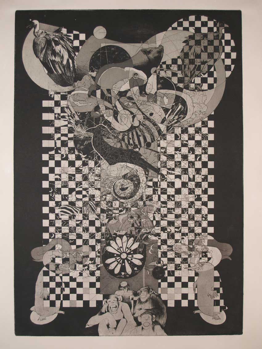 Bogati raspon sadržaja predstavljenog znakovima, podastire Vedran Karadža. On metaforički govori o prošlosti, sadašnjosti a nažalost i budućnosti uvijek izgovarajući osobno promišljanje. Impresije situacijama kojima je okružen podastire na tri grafička lista (duboki tisak – bakropis, akvatinta). Djelići memorije podignuti su na apsolutnu razinu i postaju razumljivi kao znaci, znaci upozorenja. Pred nama je materijal za kojeg bi trebalo sastaviti poseban esej jer to zaista zaslužuju ali ovdje možemo izdvojiti najvažnije karakteristike. Nazivi radova: Problem šireg zavičaja, Kronično stanje i Preferirani oblik zajednice, ujedinjavaju iskričave sekvence kojima obiluju radovi. Umjetnik sjajno komentira: „Svi radovi iz ovog ciklusa načinjeni su kao komentar ne samo trenutačne i ne samo ovdašnje društvene zbilje koja se bazira na moći, materijalizmu, strategiji osvajanja, manipulaciji. Alegorijskim prikazom likova i inih simbola izražavam zgražanje nad socijalnom dimenzijom u kojem živimo, dio mojeg bića koji je frustriran s pravom kaže da su društvo, kontekst i pravila u kojima postojimo do boli nakaradni, i daleko od nivoa na kojem bi, kao evolucijski divovi, trebali biti. I dalje smo majmuni, koji se sami sebi krevelje ugledavši se u ogledalu.“ Ovi radovi Vedrana Karadže plijene pažnju. Pred njima se morate zadržati zaista dugo kako biste izčitali ogromnu količinu informacija i poruka koje nudi umjetnik. Autor nije narativan već elokventan u uprizorenju problema s kojima je suočen i s kojima se solidarizira sa nama. Ali, i mi s njime! Prepoznajemo širok dijapazon motiva: kovanica, oružje, muzički instrumenti, šahovsko polje, raster grafičkih znakova, životinje: ptice, svinje, majmuni, lubanje poput prethistorijskih crteža, rozete, puževi, djeca, stabla… Neki od ovih oblika prisutni su samo na po jednom radu dok se drugi pojavljuj na sva tri rada. Tu je najznačajniji lik majmuna. On je dobroćudan i neodoljivo nas podsjeća na nas, pripadnike ljudskog roda. Negdje je majmun raspoložen a negdje je zabrinut ali uvijek dobrodušan. Ovi radovi podsjećaju na genealogiju bioloških vrsta. Pomalo zbrčkanu ali u poruci jasnu: Ljudski rode, zašto sramotiš majmune od kojih si potekao?