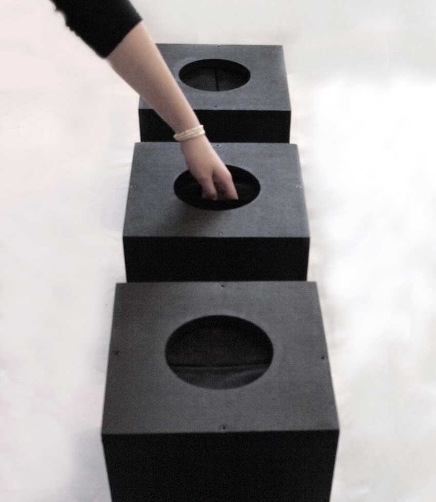 Nevidljivi svjetovi različitih frekvencija nalaze se svuda oko nas. Te, druge dimenzije ne osjećamo jer se služimo samo najjednostavnijim osjetilima. Većina ljudi opaža svijet sa samo pet osjetila: vid, sluh, okusa, opip i miris. Ova osjetila podupiru jedna drugo pa nam je spoznaja o nekoj stvari prilično kompletna. Npr, vidimo čavao i znamo da je od metala i da nema značajan miris. Eni Šuperina podastire rad koji bi trebao doprinijeti razvoju osjetila. Ovime ujedno problematizira zaostali pristup mnogim kategorijama naslijeđenim još od Newtonovskog pogleda na svijet koji kaže da je svijet mašina i da se sve odigrava po nekom propisanom i izračunljivom redu. Umjetnica gradi četiri zatvorene kutije. Na vrhu im ostavlja otvore kroz koje se ne vidi sadržaj ali se može provući ruka. Predmeti su ovo u kojima se događa susret umjetničine ideje i senzibilitet promatrača. Autorica nas tjera da zavučemo ruku u kutiju i da opipom osjetimo sadržaj. U kutije ne stavlja oblike formiranih predmeta koje treba prepoznati već građu koji označava stanja materijala. Njen rad se gleda opipom pipanjem, ispitivanjem prstima i dlanom. Materija je energija koja titra na sporoj frekvenciji. Od promatrača / pipača se očekuje da sagledaju i osvijeste karakter materijala koji je u određenoj kutiji. On, kao ni do sada neće osjetiti jako brze vibracije koje uzrokuju da materija napusti frekvencijski raspon kojeg ljudskih pet osjetila mogu opažati. No, može osvijestiti spoznaju da postoje druge dimenzije, sfere koje vibriraju prebrzo da bismo ih mogli osjetiti ili vidjeti.