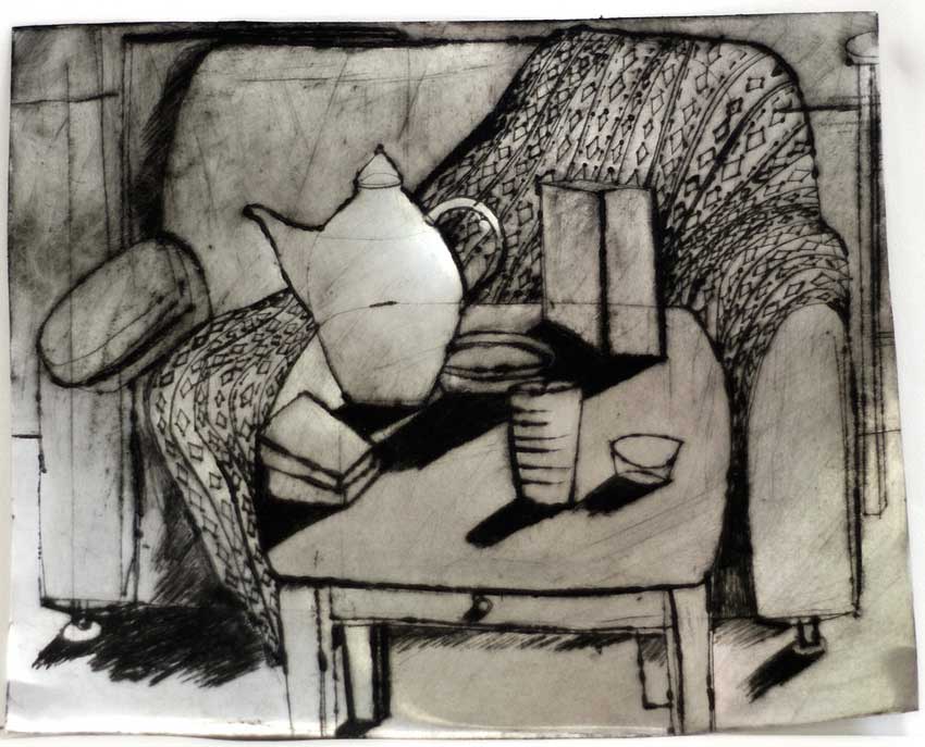 Umjetnica u doživljaju detektira oblik koji postaje osnova za daljnju fazu rada. Kompozicije većine radova, unatoč spontanosti, funkcionalne su. Pomaci, poneka necentriranost u kombinaciji s drugim detaljima u službi je dramaturgije radova. Iz poteza, zatamnjenja ili sjaja metala iščitavamo ambijente. Tu je iluzija prostora salona sa svim elementima: stol, kauč, zavjesa, svjetiljka, čajnik… Iluzija radne sobe s praznim papirima i pripremljenim olovkama. Opis javnog prijevoznog sredstva s usamljenim putnikom. Iluzija vanjskog prostora s jezerom i odrazima stabala na površini vode. Raspon tema / motiva spoznajno se širi do beskonačnog proširenja mogućnosti, do neba.