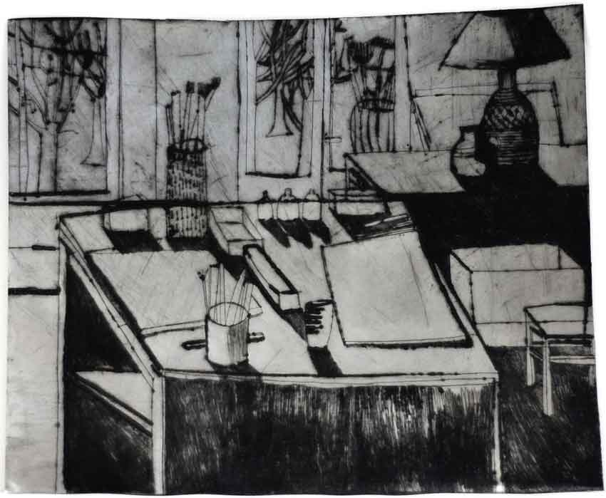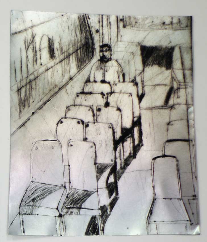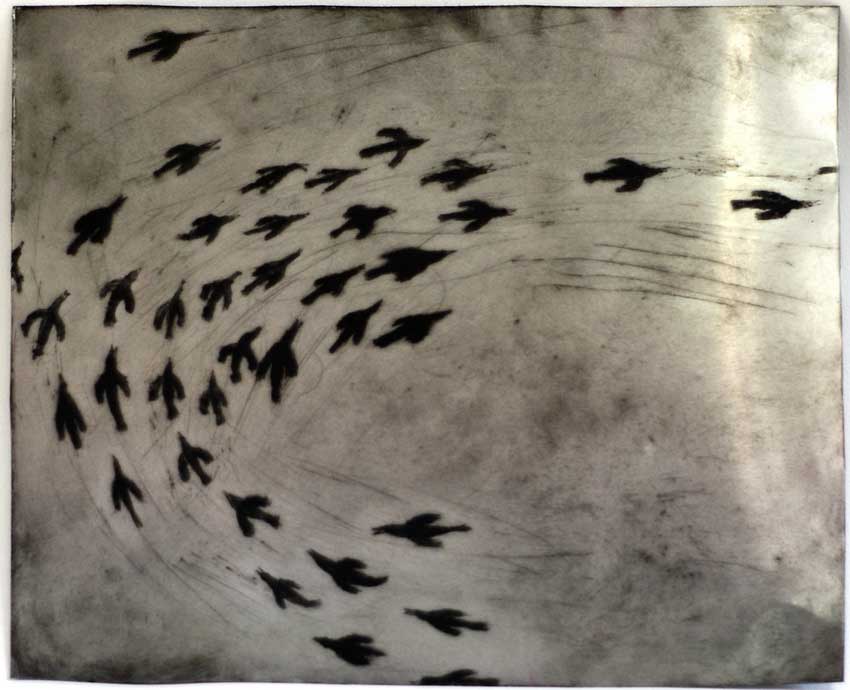 Recentnom kolekcijom likovnih promišljanja, crtežima na metalnoj podlozi, predstavlja se Irena Škrinjar. Ona u oblikovanje kreće misaono služeći se gestualnom linijom i strpljivim umnožavanjem poteza na putu ka rasteru. Čvrsta linija se pojavljuje kao obrub oblika ili dio teksture. Autorica ponekad dozvoljava slučajni rez a češće promišlja šaru kojom određuje dojam motiva. Instinktivan crtež poduprt je sjajem metalne površine. Iz tog izobilja autorica plasira profinjene situacije koje se motivikom mogu podijeliti u nekoliko tematskih dijelova koji svi problematiziraju prostore osobnih propitivanja.