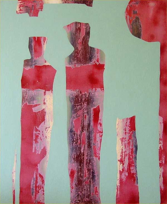 Nadrealistički dojam osnažuju neke čitkije poruke oblicima. Autorica siluete koje prikazuje stavlja u znakovite odnose. Tu su memorijske naznake roditeljstva, međuljudskih odnosa, reminiscencija iz djetinjstva. Na trenutak nam se čini da smo na posljednjoj večeri ili da je motiv komunikacija osobe i bića s krilima. Autorica nudi naznake socijalnih odnosa. Iako su one ciljane, uspijeva izbjeći stripovske konotacije. Intrigira nas bojama, tonovima podloga. Poput street arta, motivi bi mogli biti izvedeni kartonima poput tapiserije. U kasnijim susretima s istim radom, postaje svejedno da li je autorica oblike izvlačila iz strukturirane podloge ili ih je nanosila na monokromnu pozadinu.