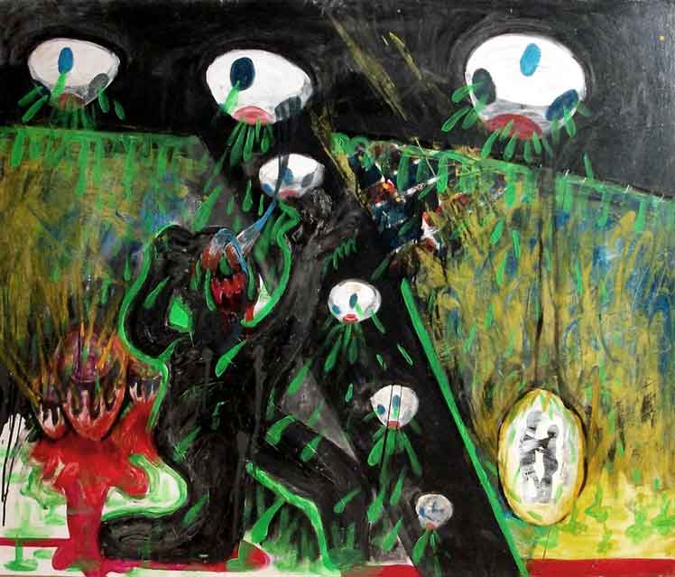agresiju, rat, oružje ujedinjuje u koloni vojnika koja prolazi kroz kadar. Crvena se pojavljuje doslovno i simbolično. Doslovno kao eksplozija, palež u pozadini ili kao podloga kojom je popločena podloga za marširanje vojne postrojbe. Autor se ne definira da li su postrojbe agresorske ili oslobodilačke. On je svjestan da svatko tko kreće u vojni pohod smatra sebe pozitivnim. Tek rezultati krvoproliće uvjetuju određenje. Pobjednik piše povijest. Tako je u podlozi provokacija promatraču: ugravirani su znakovi idejnih pokretača agresije. Na kojoj god smo strani, našli smo se ispod čizme za neku ideju. Na žalost to su uvijek uglavnom mladi ljudi. Ali, ekstremnoj ideji bilo koje orijentacije životi pojedinaca nisu bitni. U zraku ostaje problem zagađenja duša ekstremizmom. Na ovom radu nalazimo uniformirane i organizirane vojnike pa je pretpostavka da se radi o organiziranoj agresiji a ne socijalnoj revoluciji. Balija na ovom odličnom radu miješa tehnike pa jedno do drugoga nalazimo kolaž, akril i crtež olovkom. Autor tim pristupom oblikovanje dodatno zgušnjava ideju rada.
