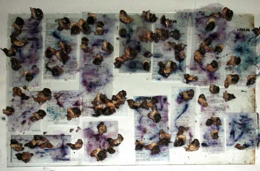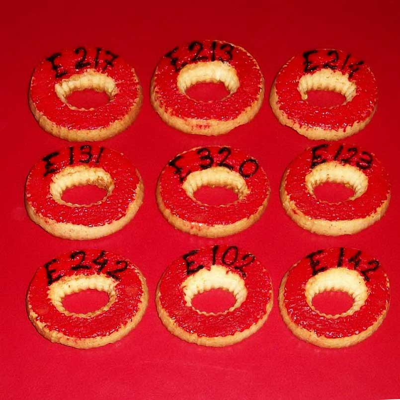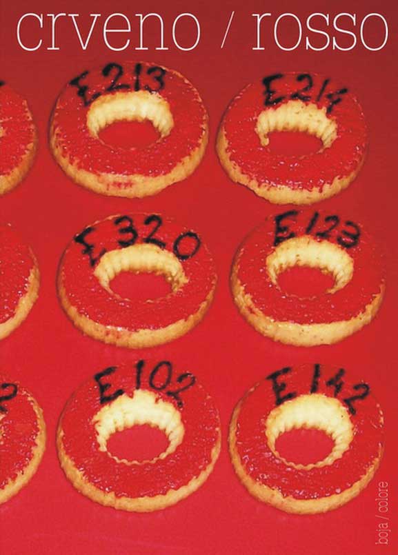 Gordana Kužina boji kolačiće, tzv. čajne kolutiće u crvenu boju upozorenja. Preko tog sloja boje umjetnica upisuje znakovite šifre. Radi se o šiframa dodataka živežnim namirnicama koji, kako se tvrdi, poboljšavaju kvalitetu. No, o čemu je zapravo riječ? Prema već objelodanjenim statistikama i izučavanjima ti dodaci ne koriste hrani kao takvoj. Oni su uglavnom dodaci koji koriste proizvođačima u zgrtanju profita. Jer, većina njih održava trajnost artikla ili popravlja ukus nadomještavajući neki skuplji prirodni sastojak. Strašna je ova spoznaja da obične ljude nitko ne štiti pa niti u Europi za koju smo se donedavna kleli da se brine o svojim stanovnicima. Upravo je objavljeno da se u Europi zabranjuju ili ograničavaju prirodni lijekovi. „Ovo je udarac na alternativnu medicinu i ustupak farmaceutskim kompanijama koje ulažu milijune u sintetičke lijekove. To znači kraj travara i medara. Budući da je Hrvatska odavno uvrstila Codex alimentarius u svoju pravnu legislativu, može se očekivati da će se brzo donijeti propis u skladu s Direktivom 2004/24/EC, koja oduzima pravo na alternativno liječenje. To je ideja farmaceutskih multikompanija koje žele uništiti konkurenciju.” (Vlasta Toth, supredsjednica Zelene liste). I kad nam se smiju zbog spominjanja teorije zavjere čini mi se da je namjera vladara svijeta i direktora farmaceutskih kompanija uništiti konkurenciju: prirodnu medicinu. Hvala umjetnici na još jednom upozorenju!