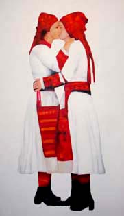 Mirjana Matić predstavlja slikarski rad začudne tematike. Motiv je odnos dvije osobe različitih spolova. Očito je pred nama krupna žena i vižljasti muškarac. Oni su u odnosu koji nije potpuno čitljiv iz pozicija tijela ali je znakovit po položajima njihovih glava. Iako su prikazani goli, ovdje nije u pitanju direktno erotika već socijalni odnos individua. Čini nam se da žena guta muškarca počevši od glave. On se ne suprotstavlja, jednostavno pasivno i bespomoćno dozvoljava egzekuciju. Naslov rada, Bogomoljka, pomaže nam u dešifriranju ovog dramatičnog rada. Čini se da umjetnica ilustrira položaj žene i muškarca za kojeg nemamo prihvaćenog stereotipa. Uobičajeno je da je muškarac jak, agresivan i diktira ženi. No, to je očito situacija izvan izoliranosti kućnog brloga. Ovdje se pokazuje agresija žene koja je ili nije zadovoljena pa iz nekog svog razloga uništava mužjaka. Mirjana Matić kao da želi ilustrirati odnos ambiciozne žene i neambicioznog muškarca. Bez obzira na stanje erotike odnos aktera je blizak jer su oba aktera razodjevena. Pored snažnijeg obličja žene ona je nadrealistički tetovirana, ispunjena motivom dezena kuhinjskog zida koji se smisleno preklapa sa čipkastim čarapama. Možda umjetnica na svjetlo dana izvlači neusklađenost bračnih drugova gdje, u osami toplog doma žena radi mobing davno izabranom muškarcu koji je oronuo i iscijeđen. Licemjernost institucije bračne zajednice propagira tu zajednicu bez obzira što su emocije već odavno nestale a bračni drugovi se još jedva podnose. Svakako znakovit rad Mirjane Matić.