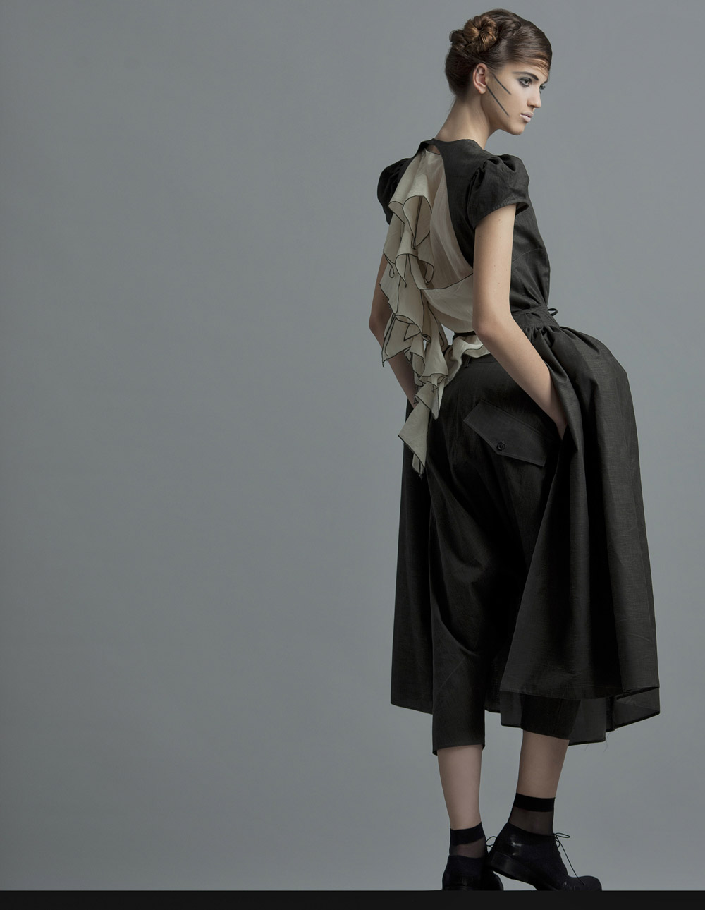 Oliver Jular pušta da ga u oblikovanju vodi „besciljna linija šava“. Zaustavit će se u trenutku kad taj intuitivni proces spoji, amalgamira mogući artistički oblik i dizajn. Rezultat je asimetrična, transrodna modna tvorevina.