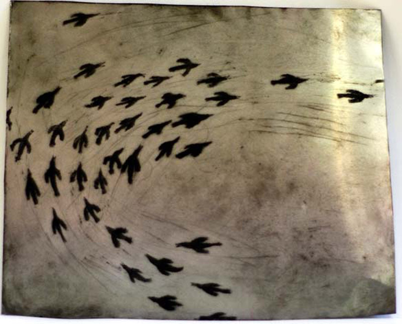 Recentnom kolekcijom likovnih promišljanja, crtežima na metalnoj podlozi, predstavlja se Irena Škrinjar. Ona u oblikovanje kreće misaono služeći se gestualnom linijom i strpljivim umnožavanjem poteza na putu ka rasteru. Čvrsta linija se pojavljuje kao obrub oblika ili dio teksture. Autorica ponekad dozvoljava slučajni rez a češće promišlja šaru kojom određuje dojam motiva. Instinktivan crtež poduprt je sjajem metalne površine. Iz tog izobilja autorica plasira profinjene situacije koje se motivikom mogu podijeliti u nekoliko tematskih dijelova koji svi problematiziraju prostore osobnih propitivanja.