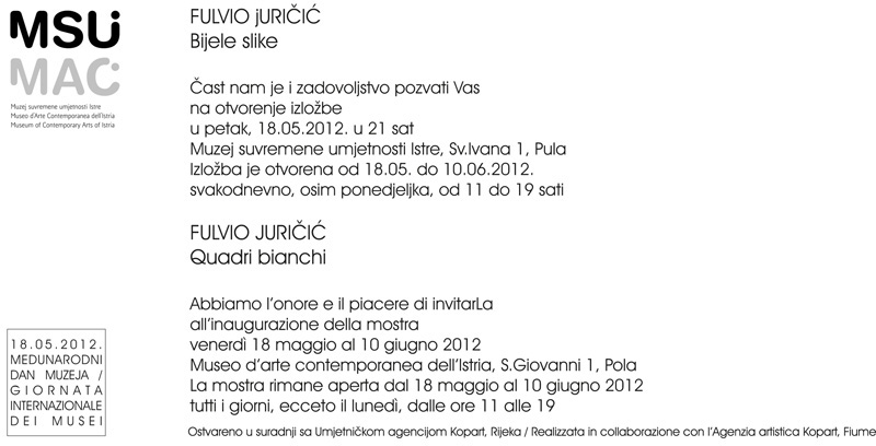 Muzej suvremene umjetnosti Istre, Pula Fulvio Juričić Bijele slike od 18. 05. (u 21.00 sat) do 10. 06. 2012. Mladen Lučić Akademija-Art
