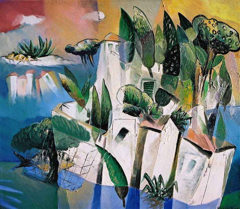 Drugi, ne manje važan dio likovne priče u Marasovićevim mediteranskim krajolicima je onaj vezan uz formu i uz specifičnu strukturalnu gradnju slike. Kompozicija je zgusnuta i oblikuju je čvrste, blokovite forme (ponekad djelujući „kamenito“), koje su uvijek najelementarnije, geometrizirane izvedenice kvadrata i kruga, dajući dojam težine, predmetnosti i tektonike. Ali samo naizgled. Jer Marasović nas upravo u ovoj fazi, kad smo se već uljuljkali u njegovu svijetu boja i oblika, uvodi u labirint percepcijskih enigmi, gotovo neprimjetno uslojavajući planove u svojim slikama i tako nas – a da nismo niti svjesni, odvodi u neke paralelne, virtualne svjetove u kojima istodobno supostoji (ili se s odmakom preklapa) više stvarnosti. Baš onako kao što u tim prostorima istodobno supostoji (kako nam je umjetnik i naslikao) i više očišta, pa stvari odjednom vidimo, u komprimiranom vremenu, odozgo, sastrane, izbliza i izdaleka. I ne znamo više jesmo li s ove, ili s one strane ogledala.