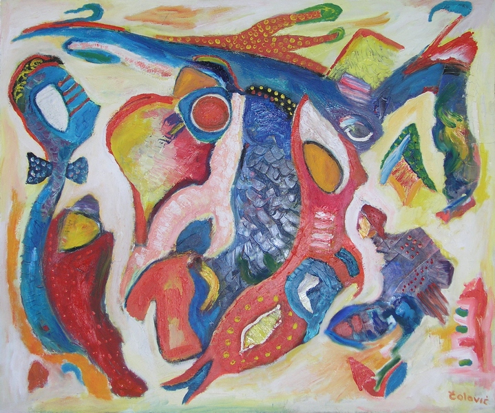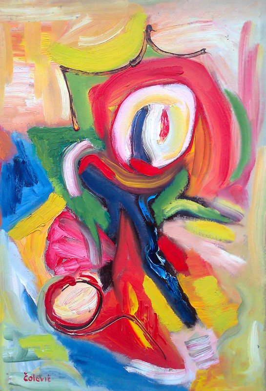 Slike Velimira Čolovića naglašavaju snagu umjetničkog doživljaja, vlastitog unutarnjeg svijeta boja. Što je doživljaj intenzivniji, kolorit je naglašeniji i zasićeniji u žestokim nanosima disonantnih slikarskih tonova. Gotovo glazbenom asocijativnošću ekspresije dobivaju svoj bučni ritam pretapanja u snažnim nanosima boja i zaobljenih i razlomljenih linija. U toj radosti stvaranja nema mjesta za tamne kolorite, svijet se disperzira pred našim očima i pod slikarevim prstima u žaru boja i ritmu asocijacija.