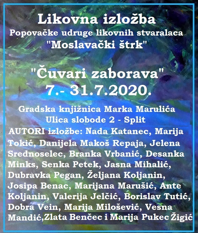 U galeriji Gradske knjižnice Marka Marulića u Splitu (Ulica slobode 2), 7. srpnja 2020. otvorena je izložba slika Popovačke udruge likovnih stvaralaca „Moslavački štrk“ pod nazivom „Čuvari zaborava“