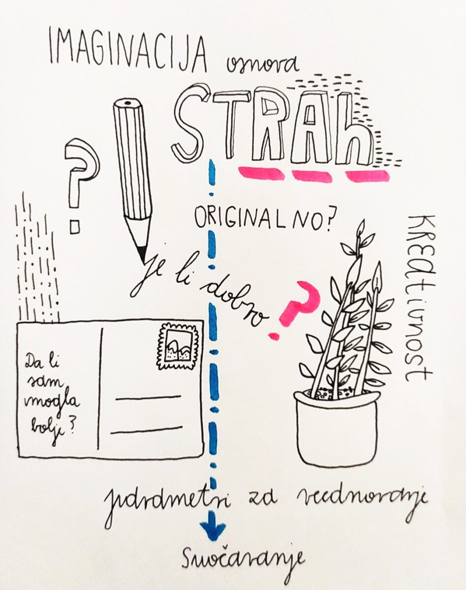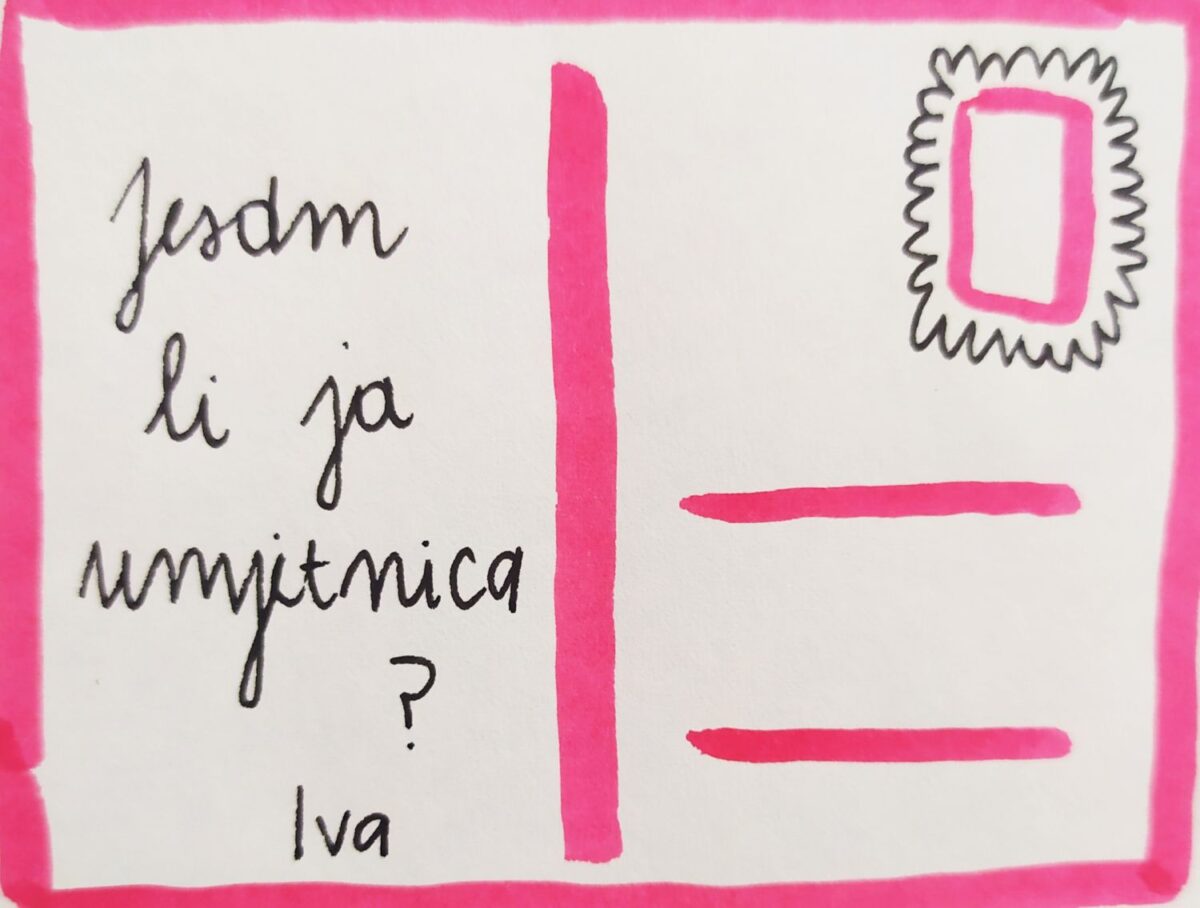 Iva Čukelj predstavlja se knjigom ilustracija kojima bilježi emocije koje proživljava dok počinje stvarati svoje radove. Tu se, u tom procesu, u najvećem postotku javljaju strahovi i sumnje. U knjizi ilustracija se emocionalno otvara posjetiteljima i time s njima želi započeti razgovore o tim emocijama, želi prikazati kako kao stvarateljica razmišlja i što propitkuje. A isto traži i od njih. Zbog toga je za izložbu pripremila i brojne razglednice koje nudi posjetiteljima s namjerom da i oni učine isto – da se na njima slikom i riječju otvore i pokažu emocije, da se suoče s onime što čuvaju u sebi i da to podijele s nekime. Razglednice posjetitelji šalju na nepoznate adrese i otvaraju se time novim iskustvima. Posjetitelji time postaju dijelom same izložbe.