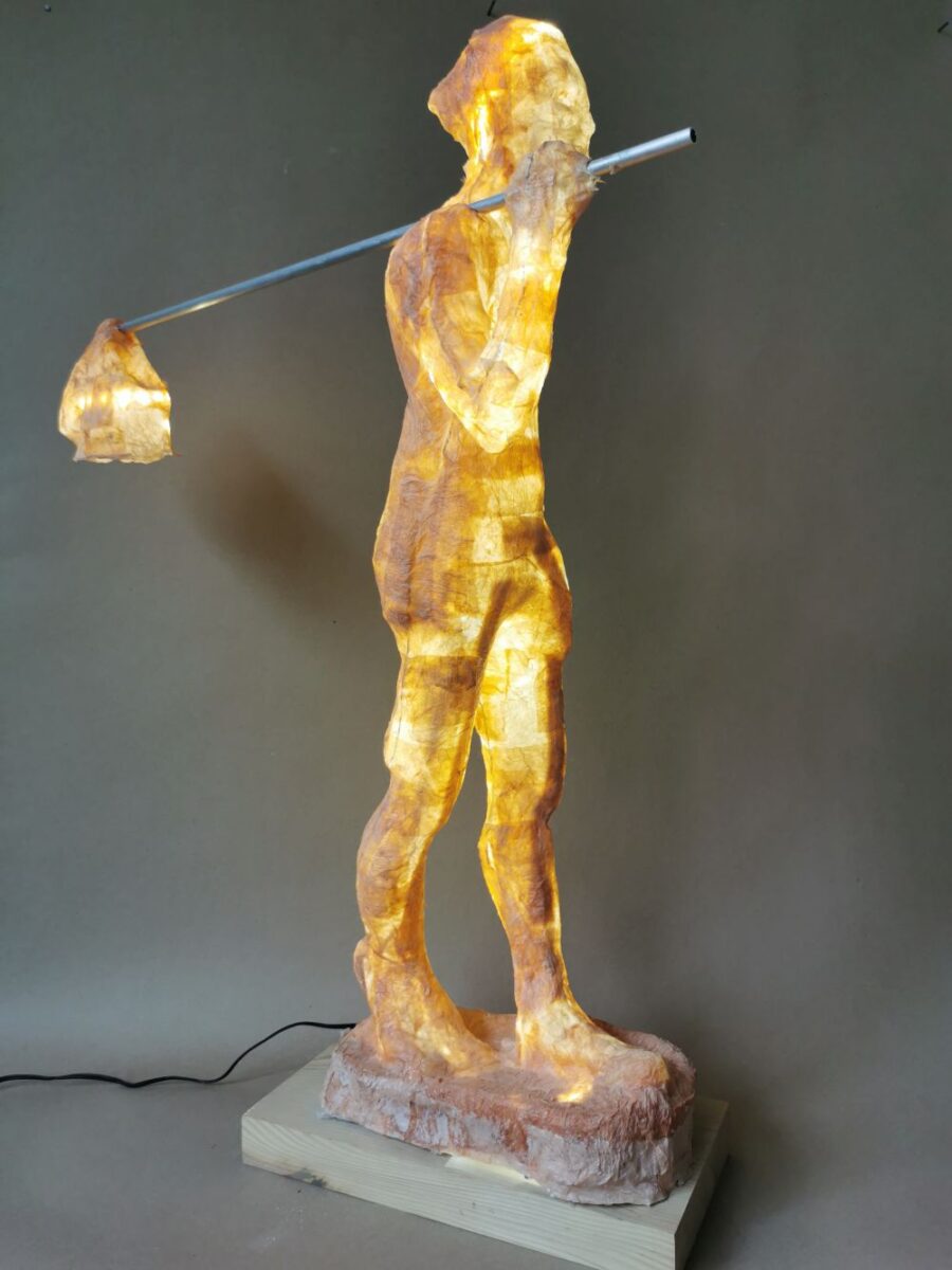 „Sretan put“: Uzimajući zahvalnost kao razlog nastajanja djela „Sretan put“, Luka Pacek stvara ovu osvjetljenu skulpturu. Djelo je posvećeno dragom mu prijatelju kojeg ovime pozdravlja, daje mu podršku u okretanju nove stranice u životu i njome se oprašta od njega, prihvaća njegov odlazak. Naizgled tužna izraza lica, lik putujućeg čovjeka kojeg prikazuje dobiva drugu dimenziju kada se unutarnje svijetlo upali. Pojavljuje se, kako sam autor to opisuje, goruća želja i borba za boljim životom. Skulptura izrađena od kaširanog papira i led traka prestaje biti samo skulptura – postaje poruka.