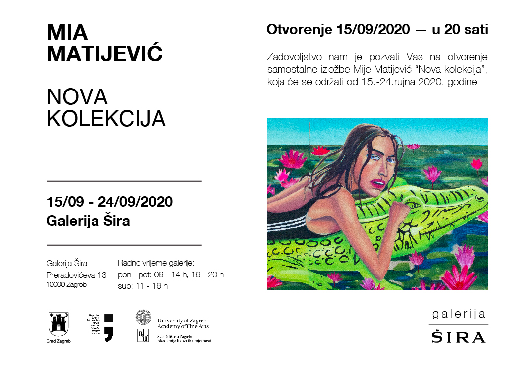 Pozivamo Vas na otvorenje prve samostalne izložbe slikarice Mije Matijević koje će se održati u Galeriji Širi 15.9.2020. u 20 sati. Izložbu možete posjetiti do 24.9.2020. radnim danom između 9 i 14h te 16 i 20h, dok je subotom galerija otvorena između 11 i 16h.