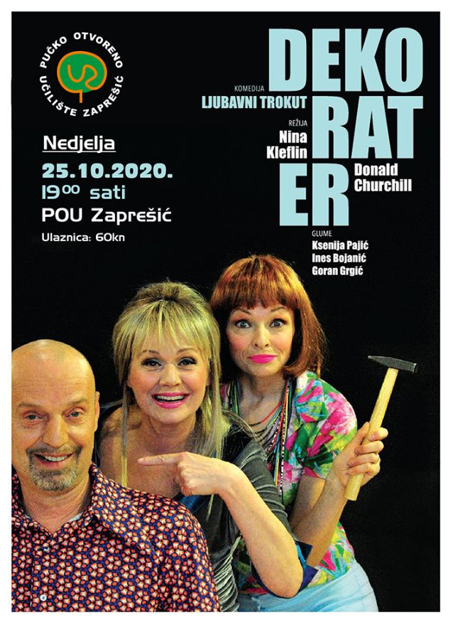 Urnebesno smiješna komedija Dekorater (ljubavni trokut), Donalda Churchilla, u izvođenju dramskih prvakinja: Ksenije Pajić, Ines Bojanić i nacionalnog dramskog prvaka Gorana Grgića.
