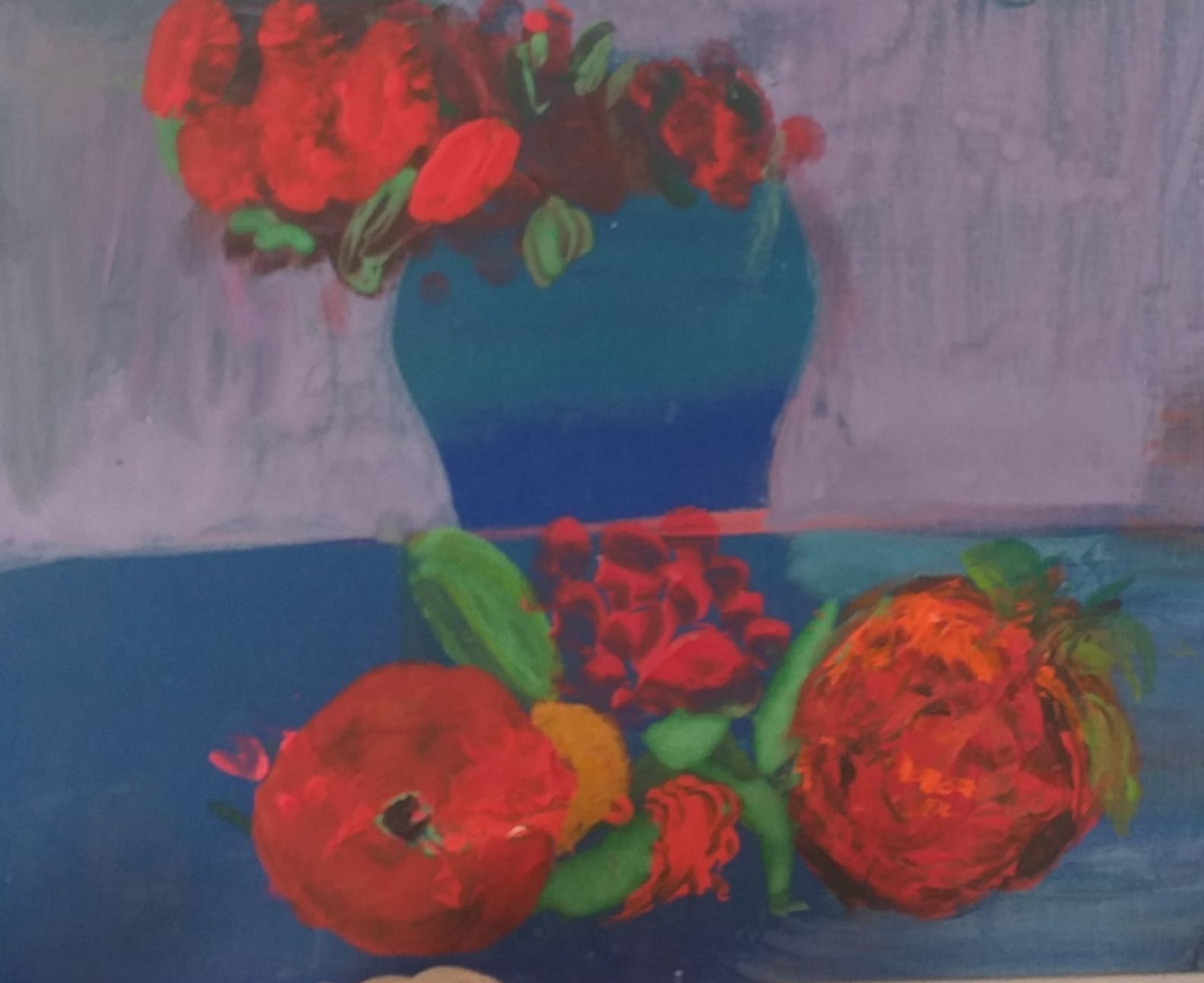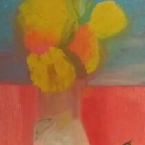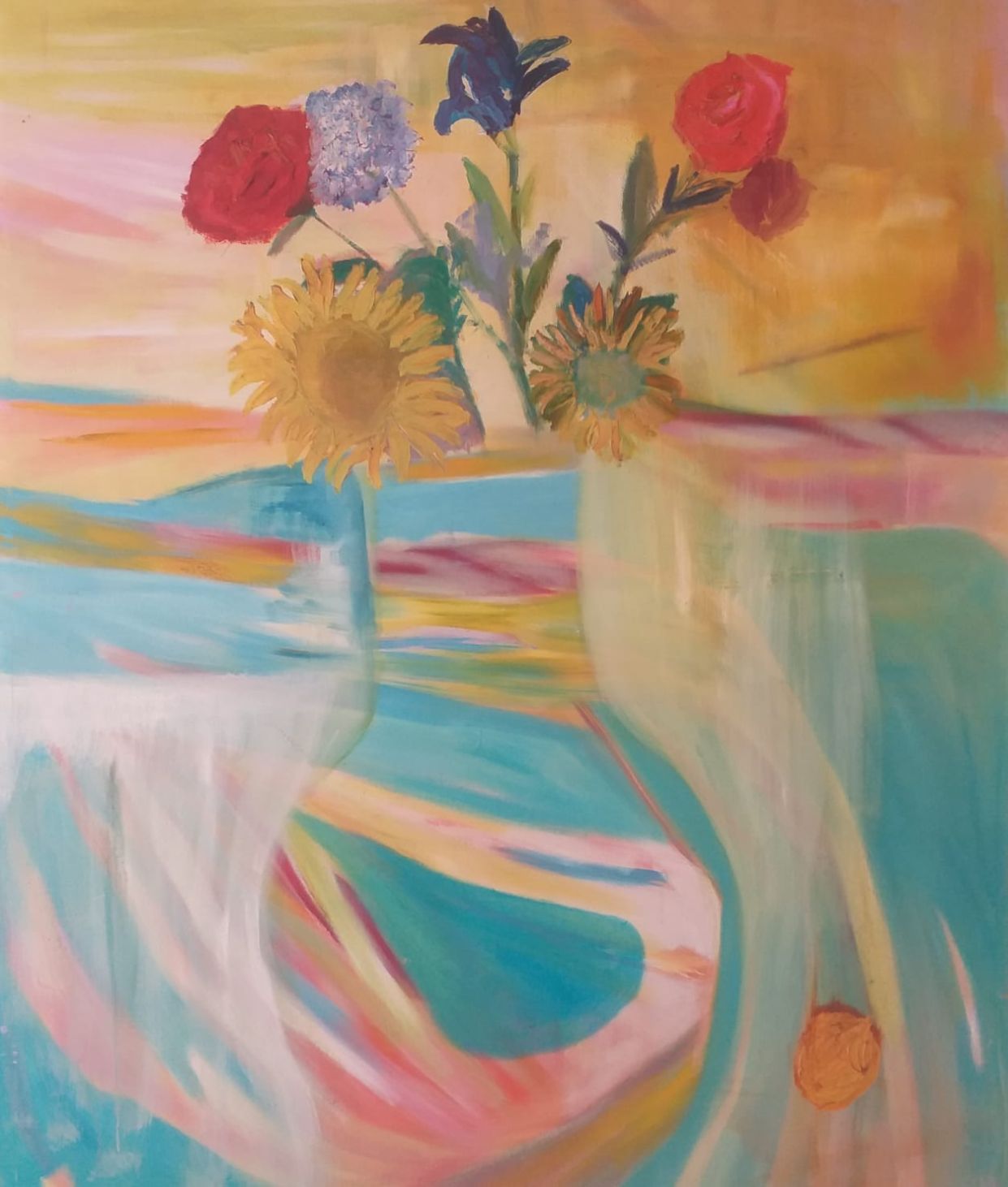 Svaki pojedini cvijet u vazi bukti bojom, ističući se pored drugih, jednako živahnih, jakih boja, iznad stakla, jednostavog, običnog oblika.
