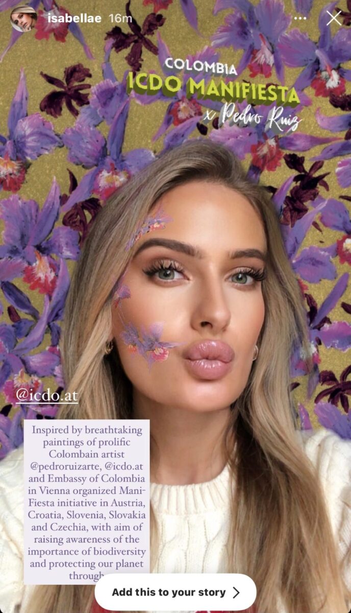 Vizualni fokus kampanje je na fotografijama napravljenim na povijesno najznačajnijim mjestima u Beču, prikazujući slike Pedra Ruiza koje pričaju priče o očaravajućim mjestima u Kolumbiji. Inicijativa je pokrenuta na društvenim mrežama, sa podrškom mnogih utjecajnih osoba iz Hrvatske, Austrije, Slovenije i Kolumbije, poput lifestyle influencerice i TV voditeljice i novinarke Hane Hadžiavdagić Tabaković (@hana), lifestyle influencerice Izabele Rakonić (@isabellae), Miss Universe Slovenije 2007. Tjase Kokalj Jerale (@tjasa_kokalj_jerala), Miss Earth Atlantico 2019 Yannis Herrera Lopez iz Kolumbije (@yannisherrera), Desire i Jennifer Selmanovic (@desnjen), kao i Parisa Taheri (@parisataheri), koji su svoje platforme iskoristili da daju glas našem planetu i podigli svijest o važnosti kampanja poput Mani-Fieste.