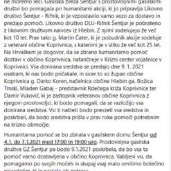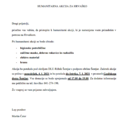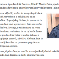 Gospodin Martin Čater, predsjednik likovne udruge Rifnik iz Šentjura u Sloveniji pokrenuo veliku humanitarnu akciju za pomoć žrtvama stradalih od potresa u Hrvatskoj te sa sudionicima i donatorima prikupili preko 4 tone hrane i drugih potrepština