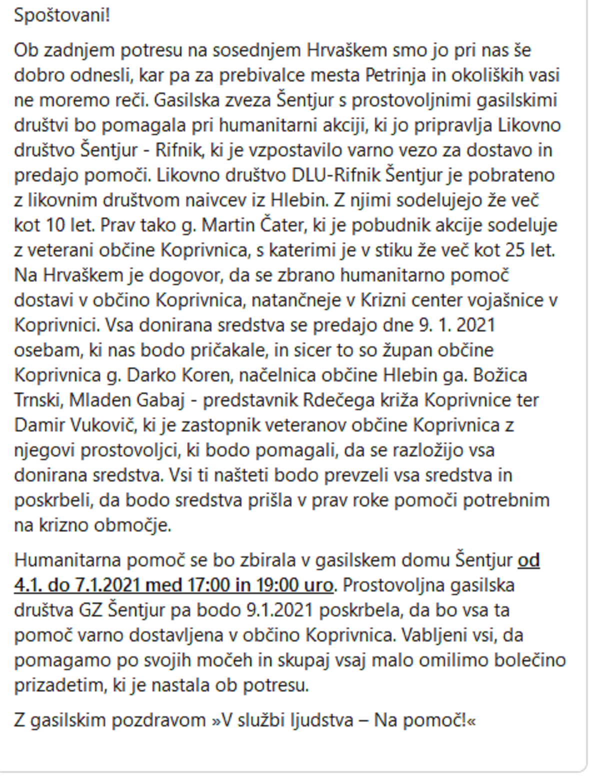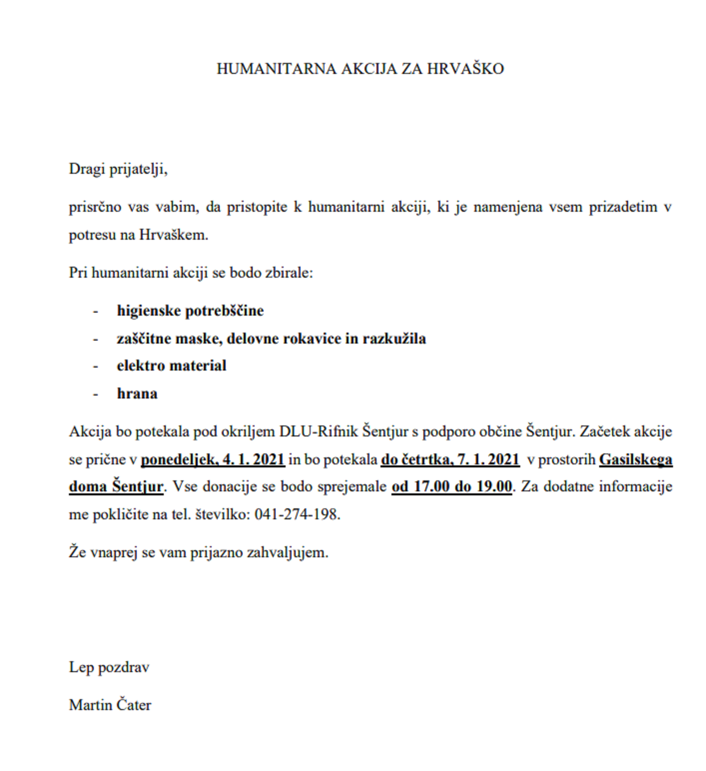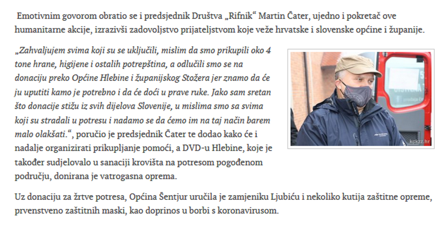 Gospodin Martin Čater, predsjednik likovne udruge Rifnik iz Šentjura u Sloveniji pokrenuo veliku humanitarnu akciju za pomoć žrtvama stradalih od potresa u Hrvatskoj te sa sudionicima i donatorima prikupili preko 4 tone hrane i drugih potrepština