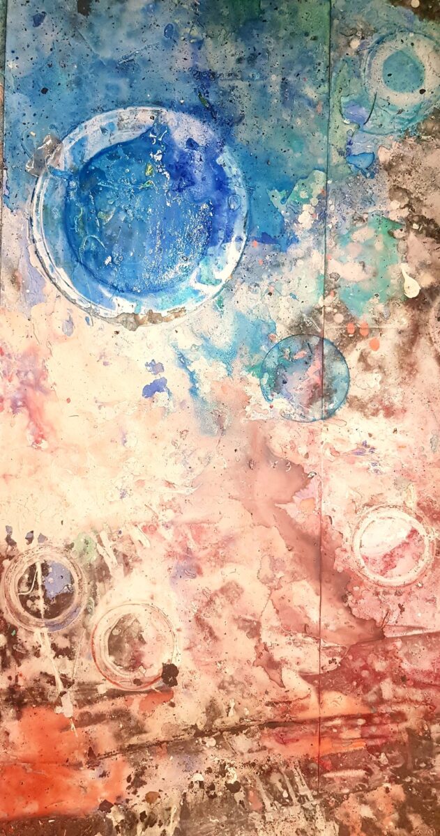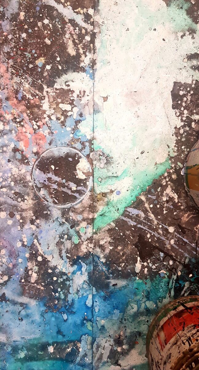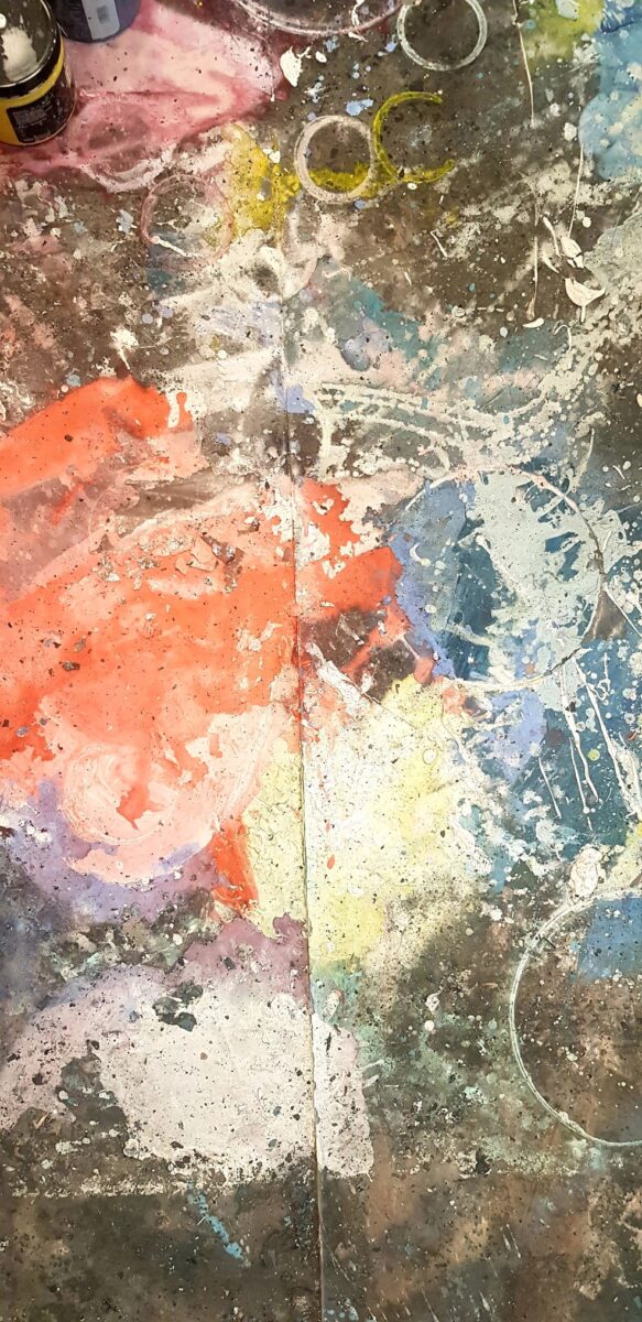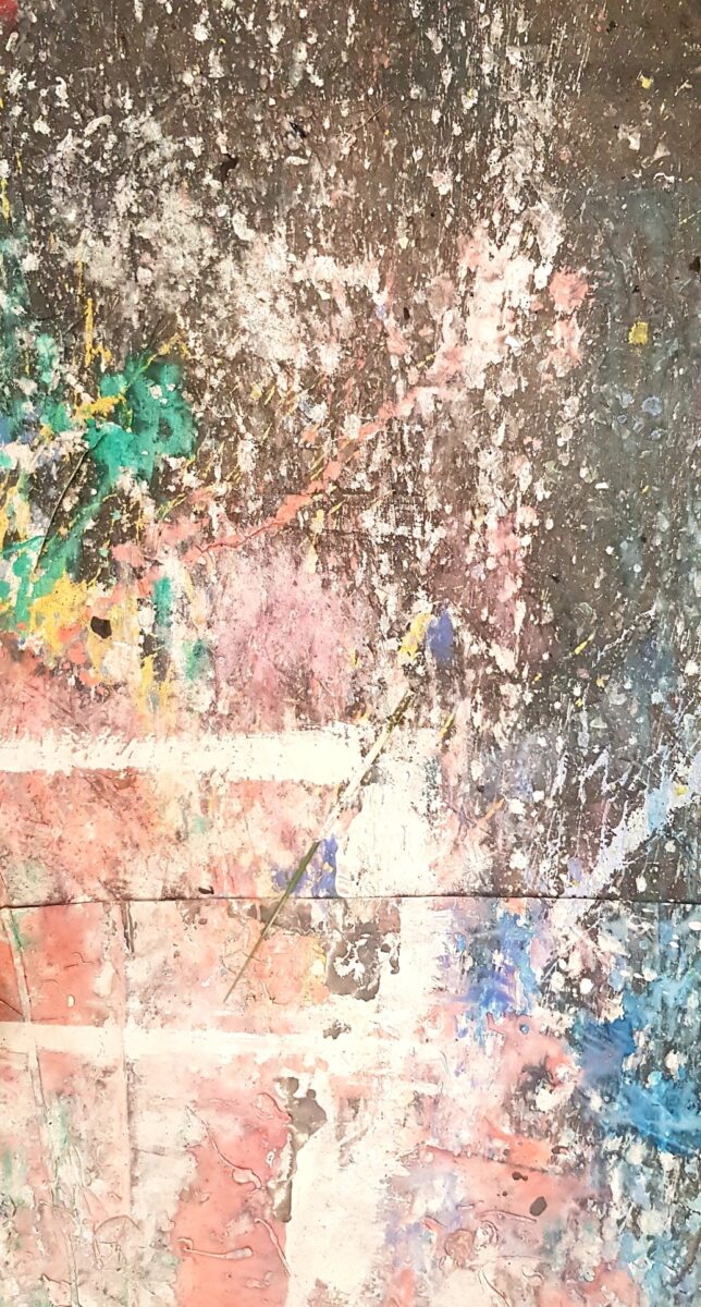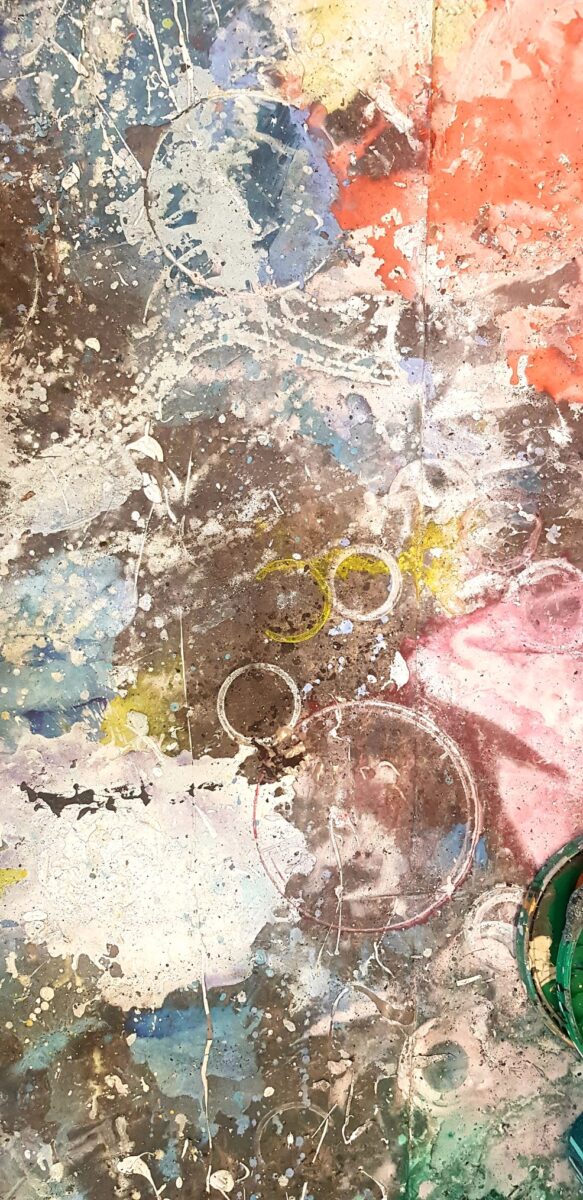 “Što se tiče ovih radova… oni su plod stečenog iskustva dugogodišnjeg oslikavanja scenografija u HNK Zagreb. Naime nakon svake završene oslikane predstave po podu slikarskog atelijera ostane od slikanja gomila zanimljivih formi, obrisa, kolorita itd. Naravno treba znati samo odabrati zanimljive segmente… otuda i sam naziv izložbe.“ govori Medvešek o novom ciklusu.