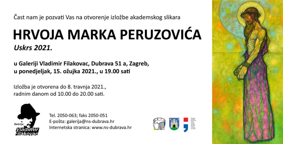 U Galeriji Vladimir Filakovac, Dubrava 51 a, otvara se 15. ožujka u 19.00 sati izložba akademskog slikara Hrvoja Marka Peruzovića pod nazivom “Uskrs 2021.”. Izložba je otvorena do 8. travnja 2021., radnim danom od 10.00 do 20.00 sati. Ulaz je slobodan. Otvorenje izložbe održat će se u skladu s propisanim epidemiološkim mjerama.