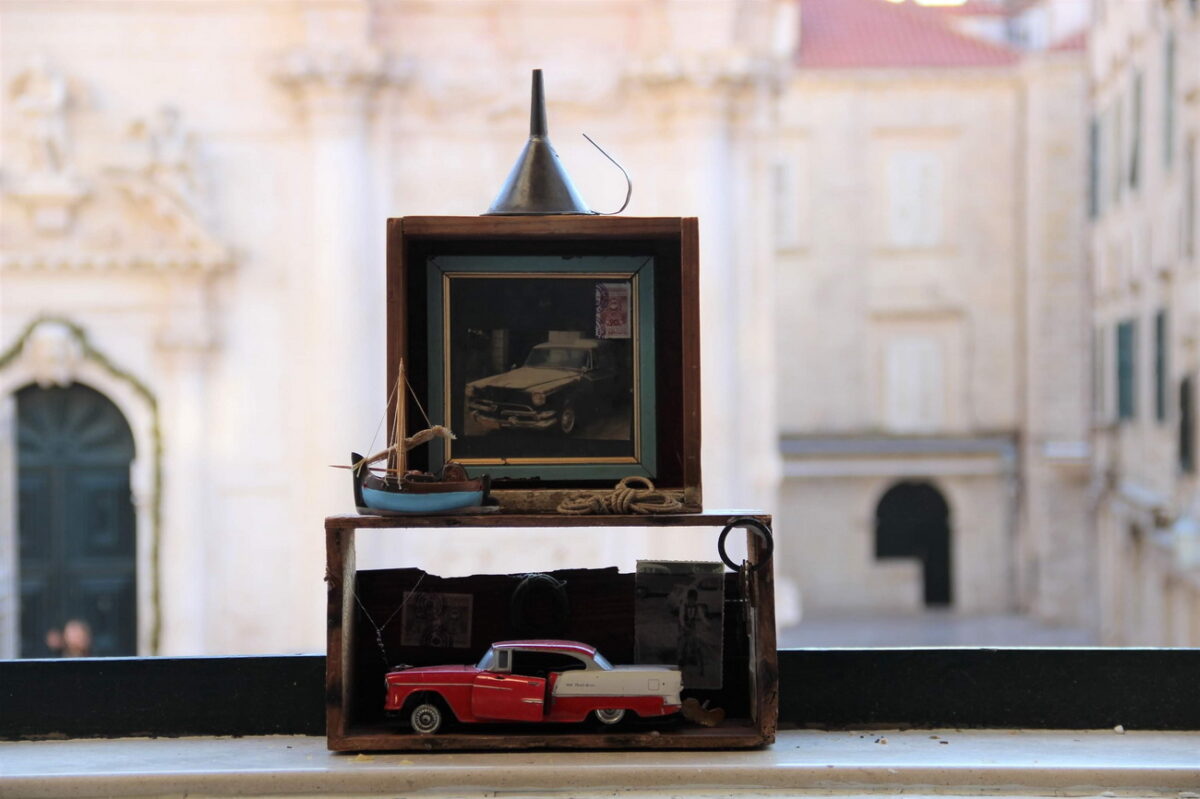 Prostorni dijelovi projekta imaju iskazano porijeklo i materijal: to su police, kutije, dijelovi namještaja, arhaične boce, kićaste makete auta ili brodova, predmeti kućanstva, poštanske marke, namotaji konopa, dijelovi namještaja… Autor poštuje materijal i ne sakriva mu bit, unatoč tome što, vođen nakanom (do)davanja novog smisla, drastično mijenja doživljaj. Svi izlošci su objekti u prostoru što odaje skulptorski pristup. Ovu izložbenu prezentaciju predstavljam kao konceptualni projekt jer nosi karakteristike hibridne, ali promišljene cjeline.