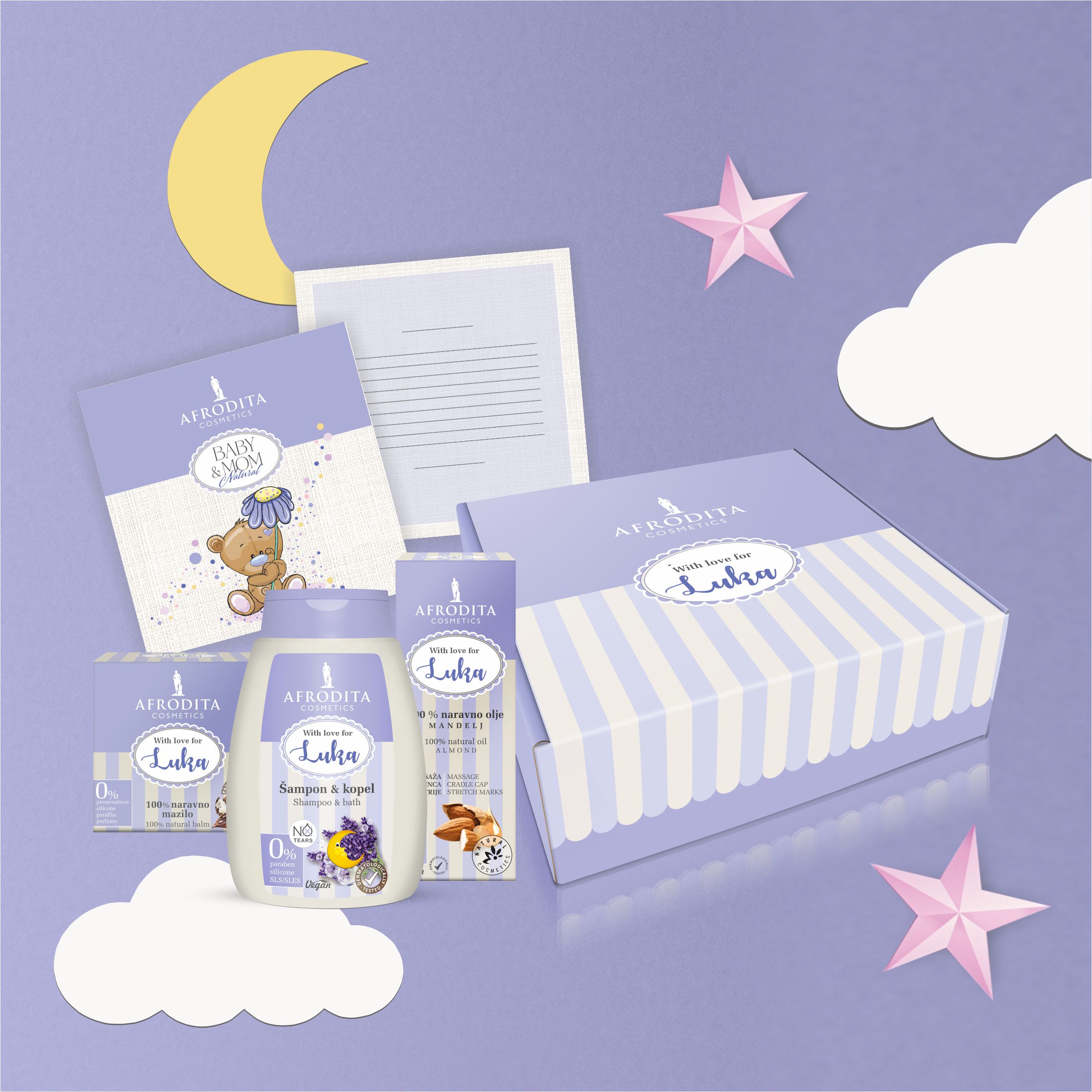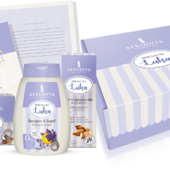 Poklonite uspješnice za njegu Baby & Mom Natural s ispisanim imenom djeteta u sasvim osobnom poklon pakiranju koji sadrži šampon i kupku, 100% prirodnu mast i 100% prirodno bademovo ulje te čestitku s jedinstvenom porukom. Dobre želje i misli možete sami ispisati na personaliziranu karticu ili će Afrodita isto otisnuti po vašoj želji.