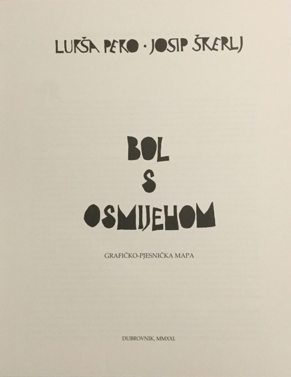 Nedavno je u Dubrovniku objavljena grafičko pjesnička mapa, dvojice uglednih umjetnika, akademskog slikara Lukše Peke i akademskog slikara i pjesnika Josipa Škerlja, Bol s osmijehom